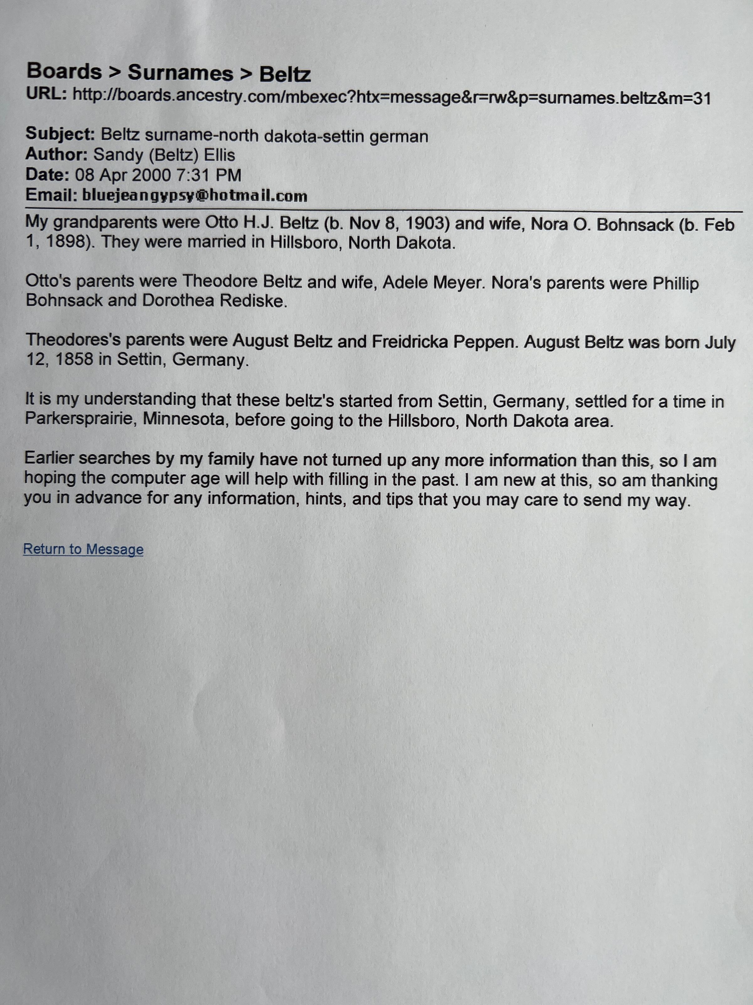 A file of research documents by Sandy Beltz Ellis, daughter of Otto Beltz and Nora Bohnsack. The documents are printouts of internet searches for this family.Cataloged By