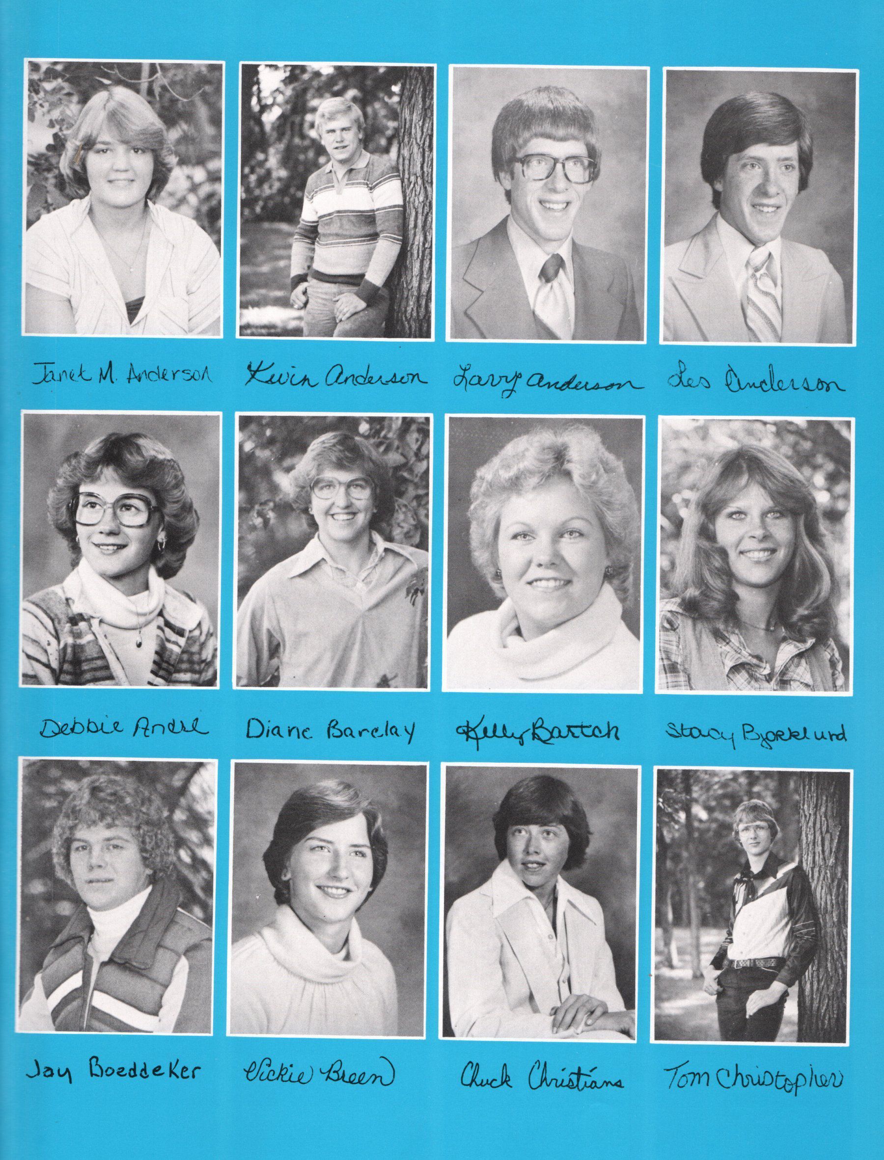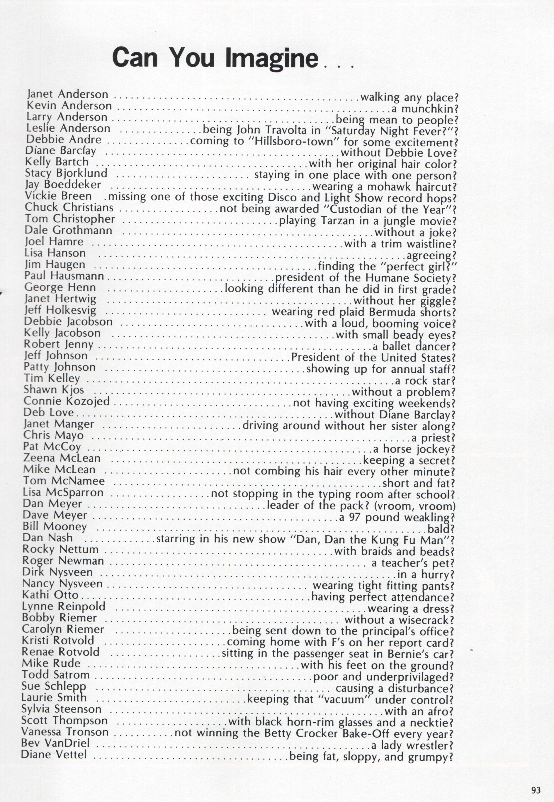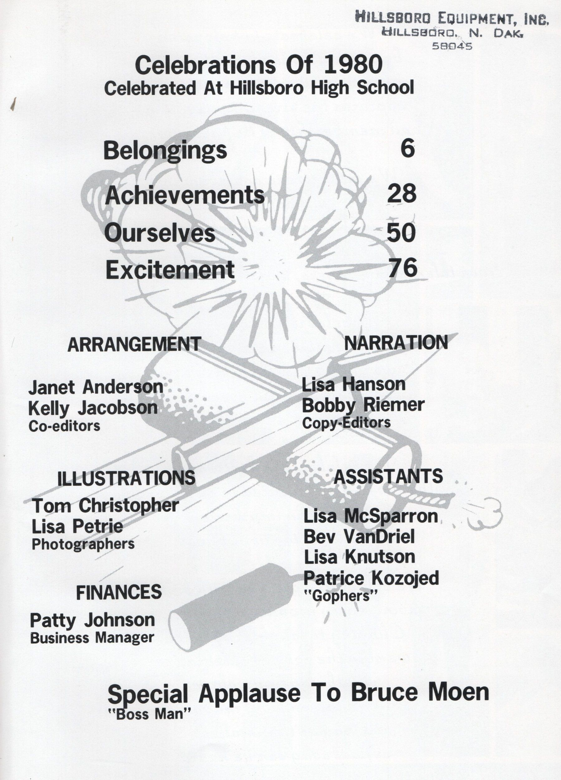 The Class of 1980 Hillsboro High School Yearbook, titled: Celebrations of 1980, includes five pages of Class of 1980 Senior student photographs for: Janet Anderson, Kevin Anderson, Larry Anderson, Leslie Anderson, Debbie Andre, Diane Barclay, Kelly Bartch, Stacy Bjorklund, Jay Boeddeker, Vickie Breen, Chuck Christians, Tom Christopher, Dale Grothmann, Joel Hamre, Lisa Hanson, Jim Haugen, Paul Hausmann, George Henn, Janet Hertwig, Jeff Holkesvig, Debbie Jacobson, Kelly Jacobson, Robert Jenny, Jeff Johnson, Patty Johnson, Timothy Kelley, Shawn Kjos, Connie Kozojed, Debra Love, Janet Manger, Chris Mayo, Patrick McCoy, Eileen McLean, Mike McLean, Tom McNamee, Lisa McSparron, Daniel Meyer, Dave Meyer, William Mooney, Daniel Nash, Rocky Nettum, Roger Newman, Dirk Nysveen, Nancy Nysveen, Kathi Otto, Lynne Reinpold, Bobby Riemer, Carolyn Riemer, Kristi Rotvold, Renae Rotvold, Michael Rude, Todd Satrom, Susanne Schlepp, Laurie Smith, Sylvia Steenson, Scott Thompson, Vanessa Tronson, and Diane Vettel. Not pictured: Bev VanDriel. A Class of 1980 list of "Can you imagine" is also included from page 93.