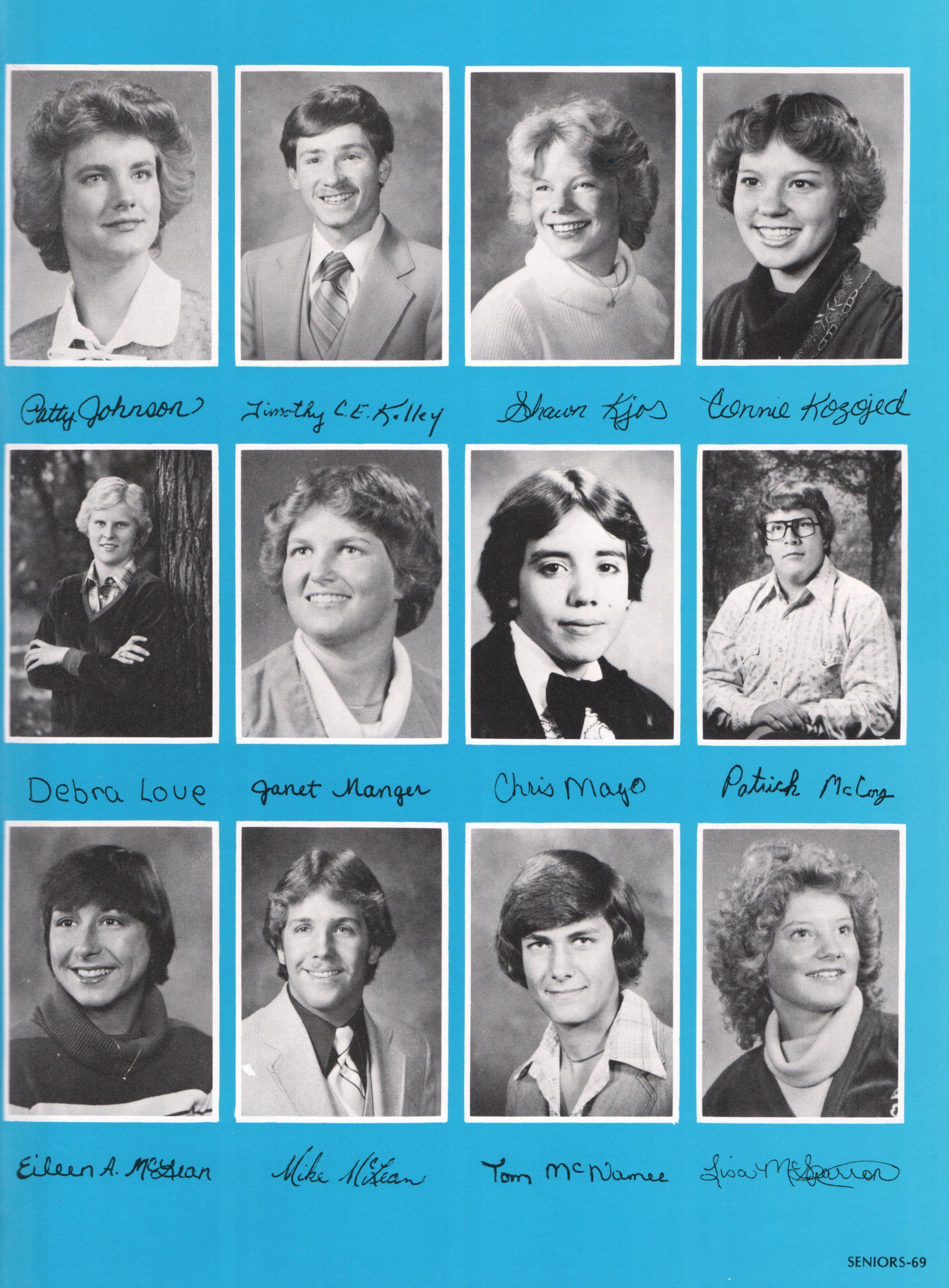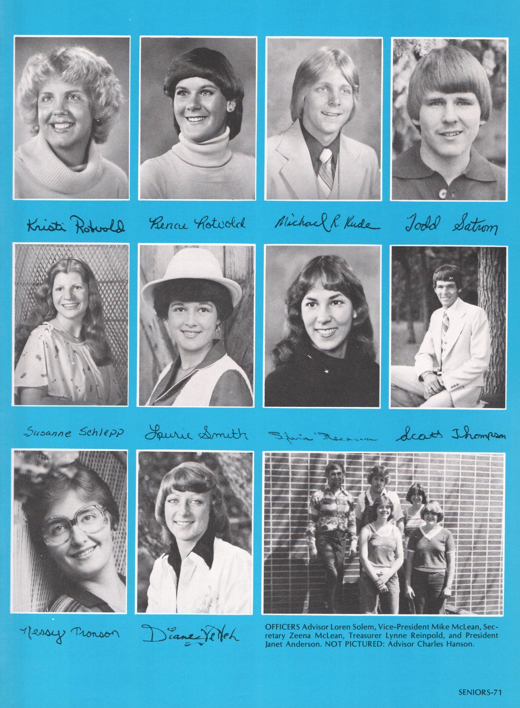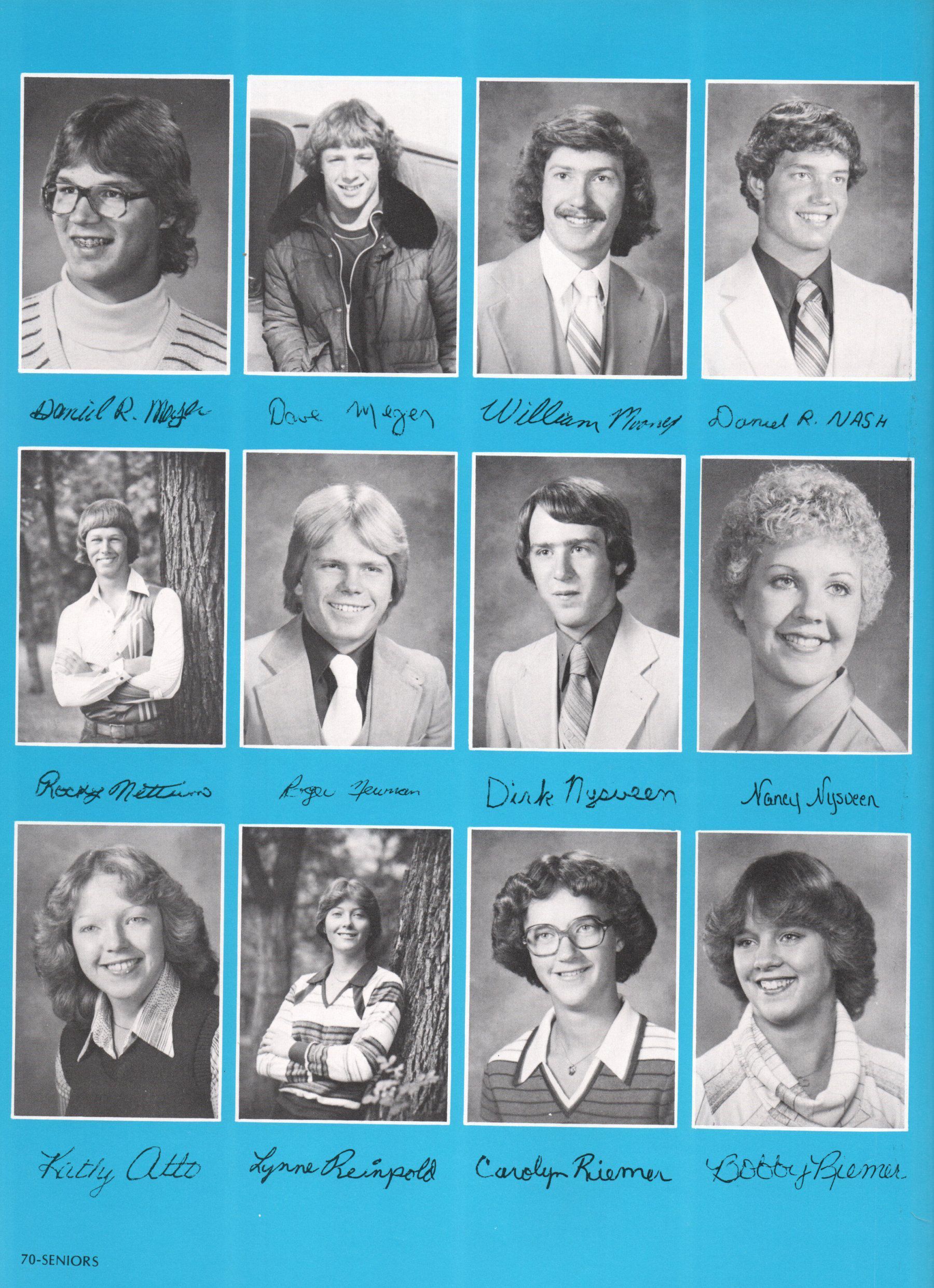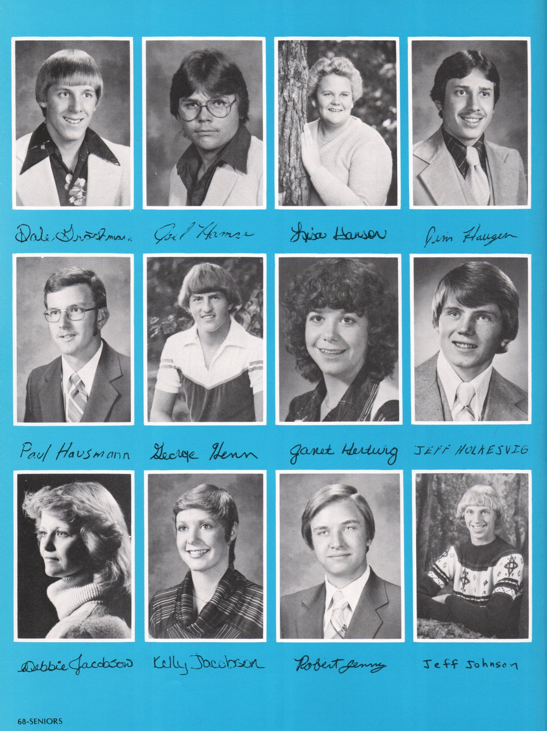 The Class of 1980 Hillsboro High School Yearbook, titled: Celebrations of 1980, includes five pages of Class of 1980 Senior student photographs for: Janet Anderson, Kevin Anderson, Larry Anderson, Leslie Anderson, Debbie Andre, Diane Barclay, Kelly Bartch, Stacy Bjorklund, Jay Boeddeker, Vickie Breen, Chuck Christians, Tom Christopher, Dale Grothmann, Joel Hamre, Lisa Hanson, Jim Haugen, Paul Hausmann, George Henn, Janet Hertwig, Jeff Holkesvig, Debbie Jacobson, Kelly Jacobson, Robert Jenny, Jeff Johnson, Patty Johnson, Timothy Kelley, Shawn Kjos, Connie Kozojed, Debra Love, Janet Manger, Chris Mayo, Patrick McCoy, Eileen McLean, Mike McLean, Tom McNamee, Lisa McSparron, Daniel Meyer, Dave Meyer, William Mooney, Daniel Nash, Rocky Nettum, Roger Newman, Dirk Nysveen, Nancy Nysveen, Kathi Otto, Lynne Reinpold, Bobby Riemer, Carolyn Riemer, Kristi Rotvold, Renae Rotvold, Michael Rude, Todd Satrom, Susanne Schlepp, Laurie Smith, Sylvia Steenson, Scott Thompson, Vanessa Tronson, and Diane Vettel. Not pictured: Bev VanDriel. A Class of 1980 list of "Can you imagine" is also included from page 93.