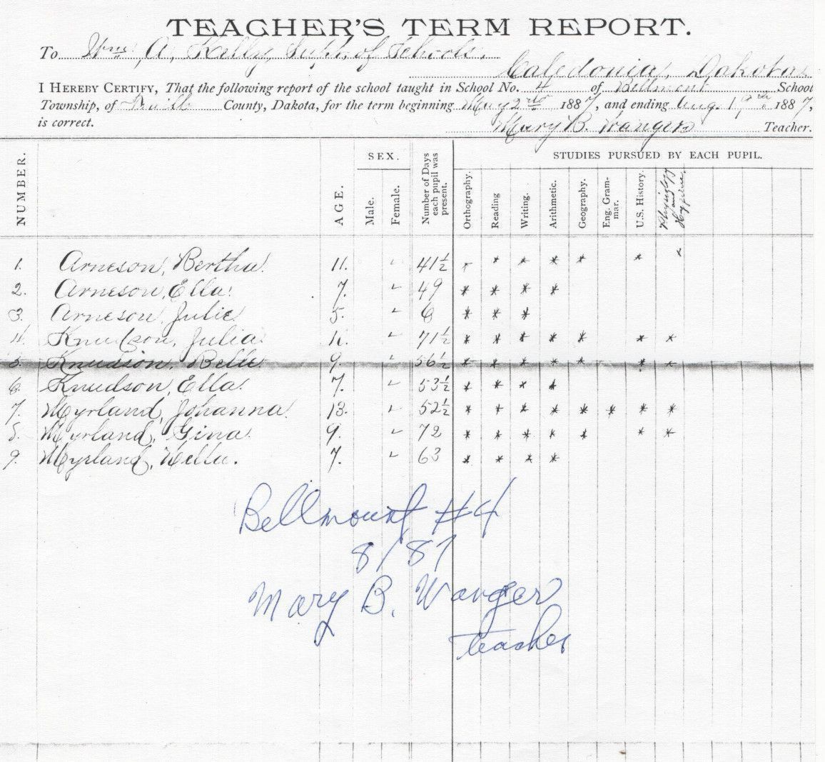 In the 1887 Summer Term (02 May--19 Aug), Belmont School No. 4 teacher Mary B. Wanger reported attendances and studies pursued for 9 students, including Bertha Arneson, Ella Arneson, Julie Arneson, Belle Knudson, Ella Knudson, Julia Knudson, Gina Myrland, Johanna Myrland, and Wella Myrland.
