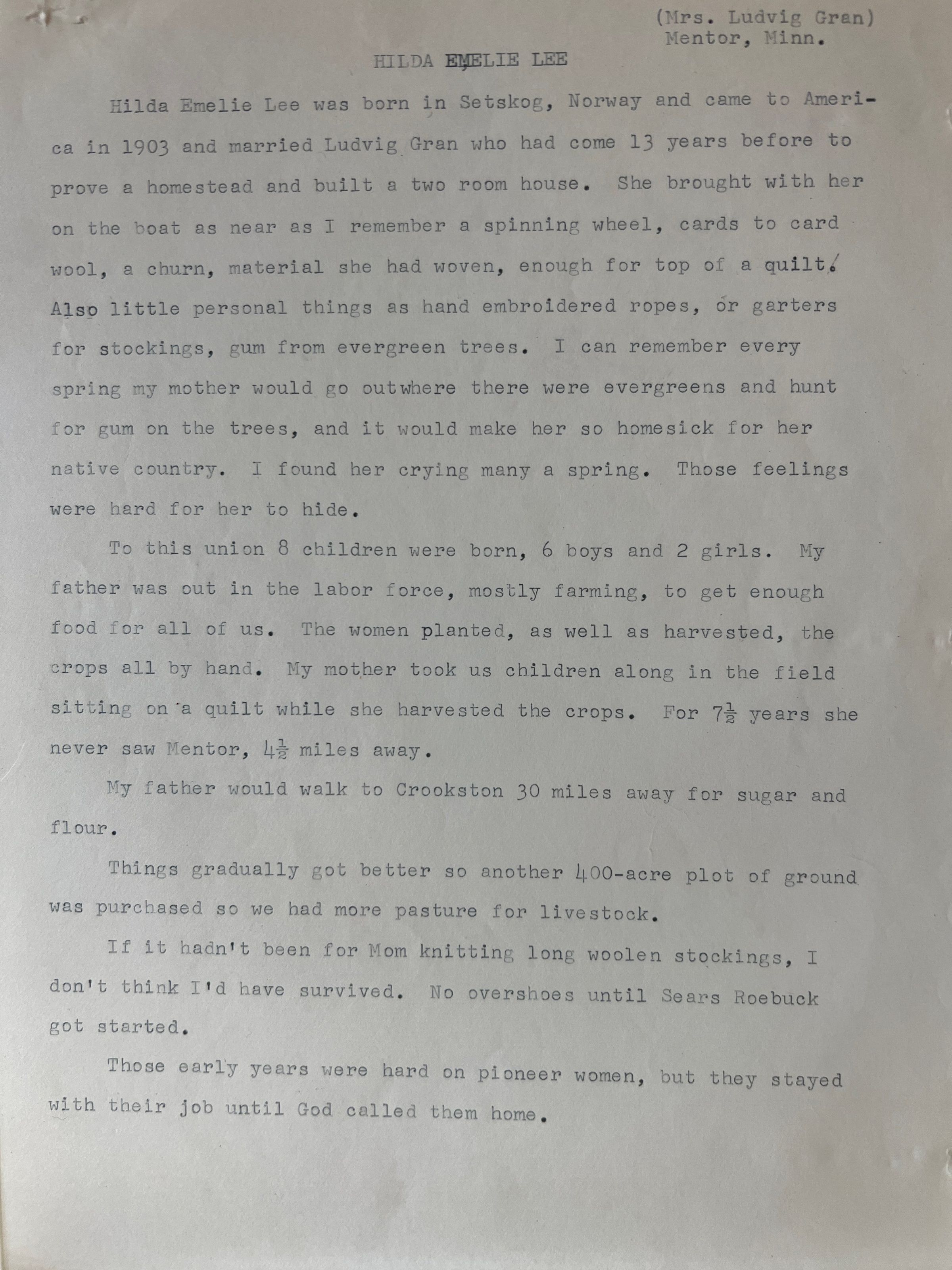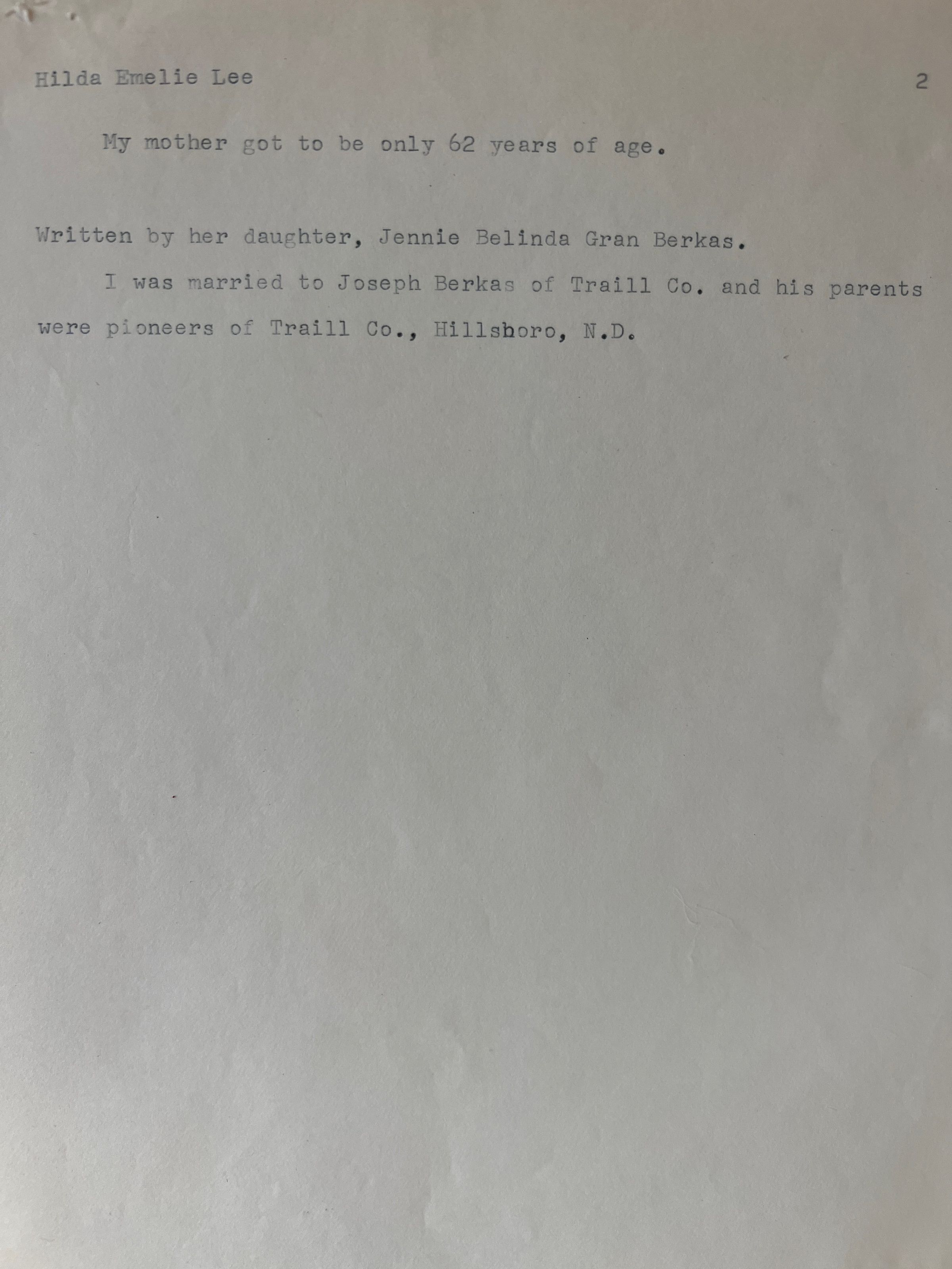 This folder has two pages written by Jennie Gran (Mrs. Joseph Berkas of Traill County) describing the life of Hilda Emelie Lee, who came to America in 1903 and married Ludvig Gran. They farmed by Mentor, MN, and had 8 children, including Jennie who married Joseph Berkas of Traill County. Joseph's parents were pioneers of East Blanchard (Bloomfield) Township.Acquisition