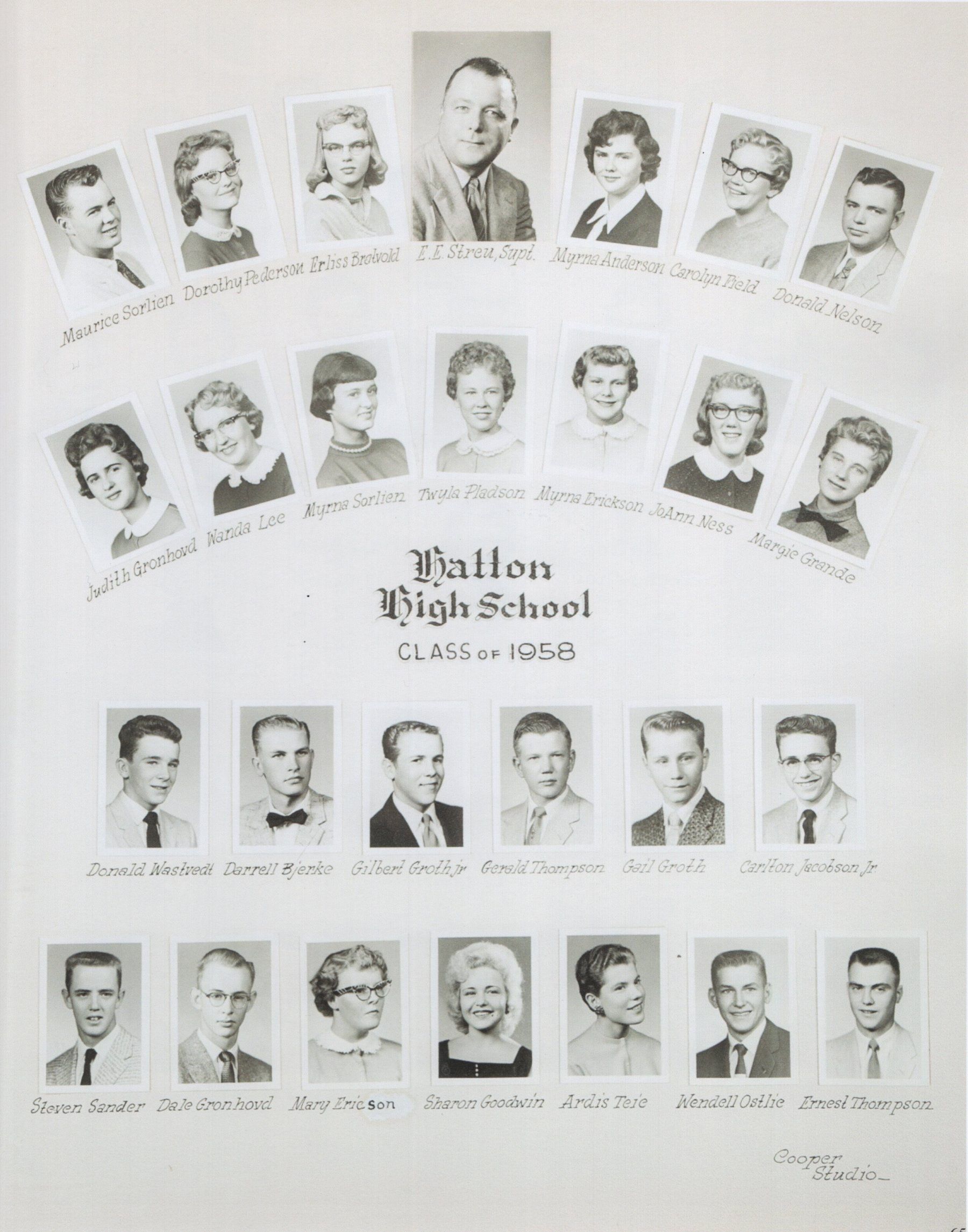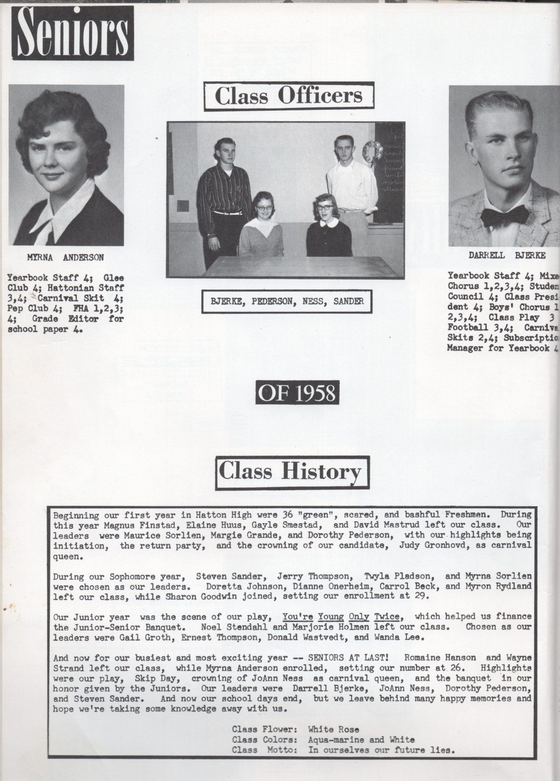 The 1958 yearbook includes four pages of Senior student photographs for: Myrna Anderson, Darrell Bjerke, Erliss Bratvold, Myrna Erickson, Mary Ann Ericson, Carolyn Field, Sharon Goodwin, Margie Grande, Dale Gronhovd, Judy Gronhovd, Gail Groth, Gilbert Groth Jr., Carlton Jacobson, Wanda Lee, Donald Nelson, Joann Ness, Wendell Ostlie, Dorothy Pederson, Twyla Pladson, Steven Sander, Maurice Sorlien, Myrna Sorlien, Ardis Teie, Ernest Thompson, Gerald Thompson, and Donald Wastvedt.