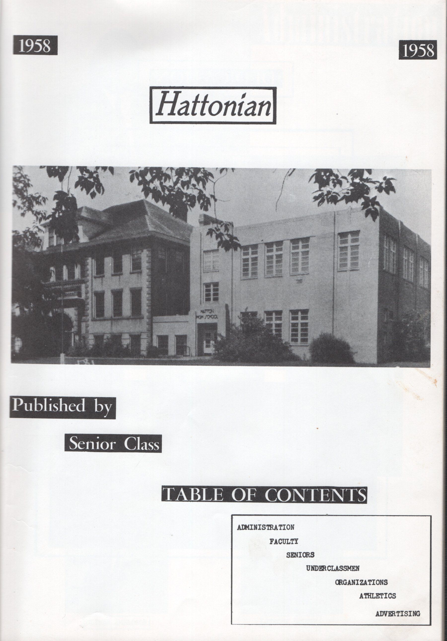 The Class of 1958 Hatton High School Yearbook, titled 58 Hattonian, includes a photograph of the Hatton High School Class of 1958 on page 65 in the All School Reunion book, "Hatton Flyers".