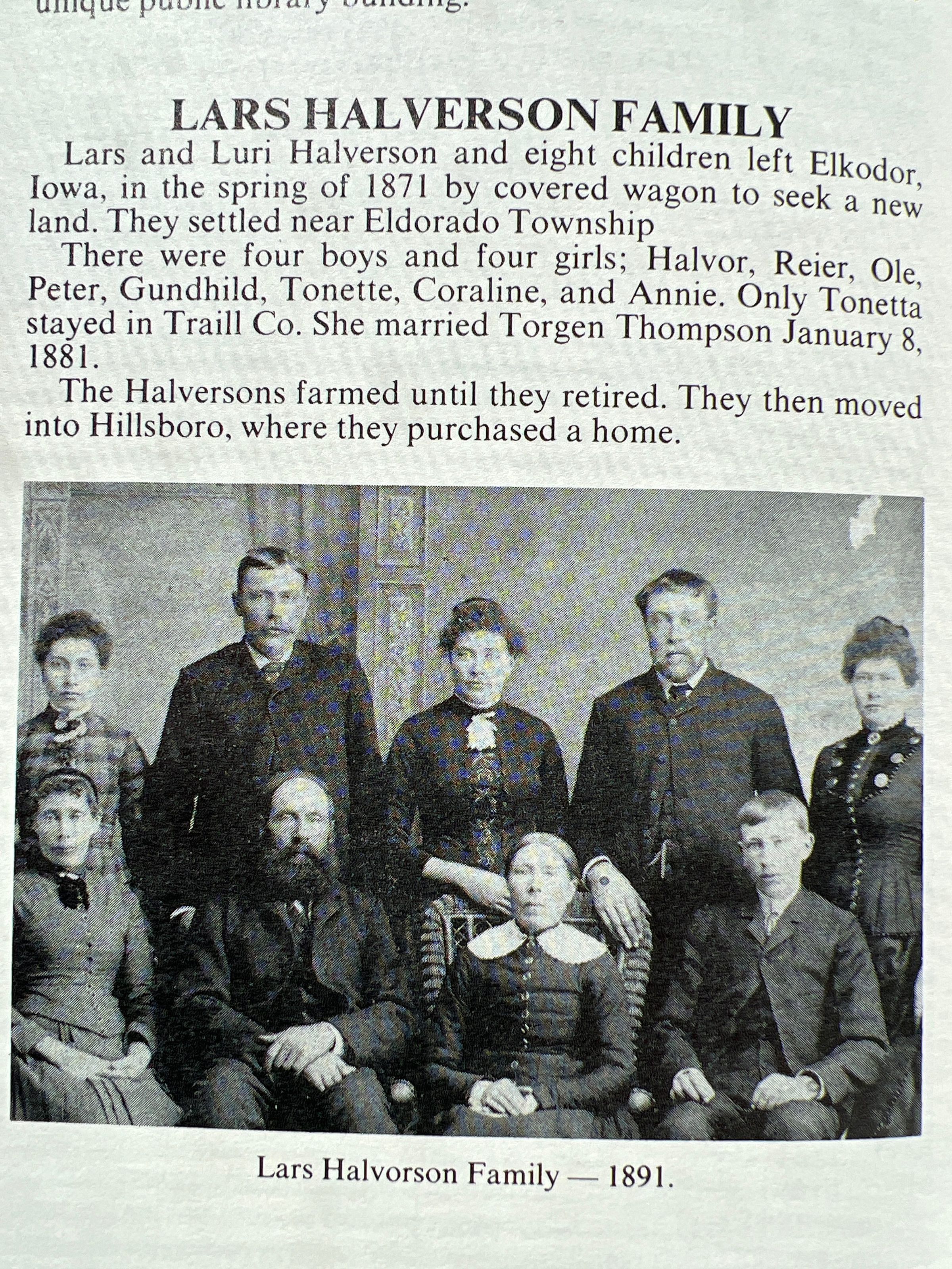 This family file contains information documented on page 72 in the Traill County History book, Vol.1. Lars and Luri Halverson were 1871 pioneers of Eldorado Township in Traill County, Dakota Territory, where they raised eight children, Halvor Halvorson, Reier Halvorson, Ole Halvorson, Peter Halvorson, Gunhild Halvorson, Tonette Halvorson, Coraline Halvorson and Annie Halvorson.
