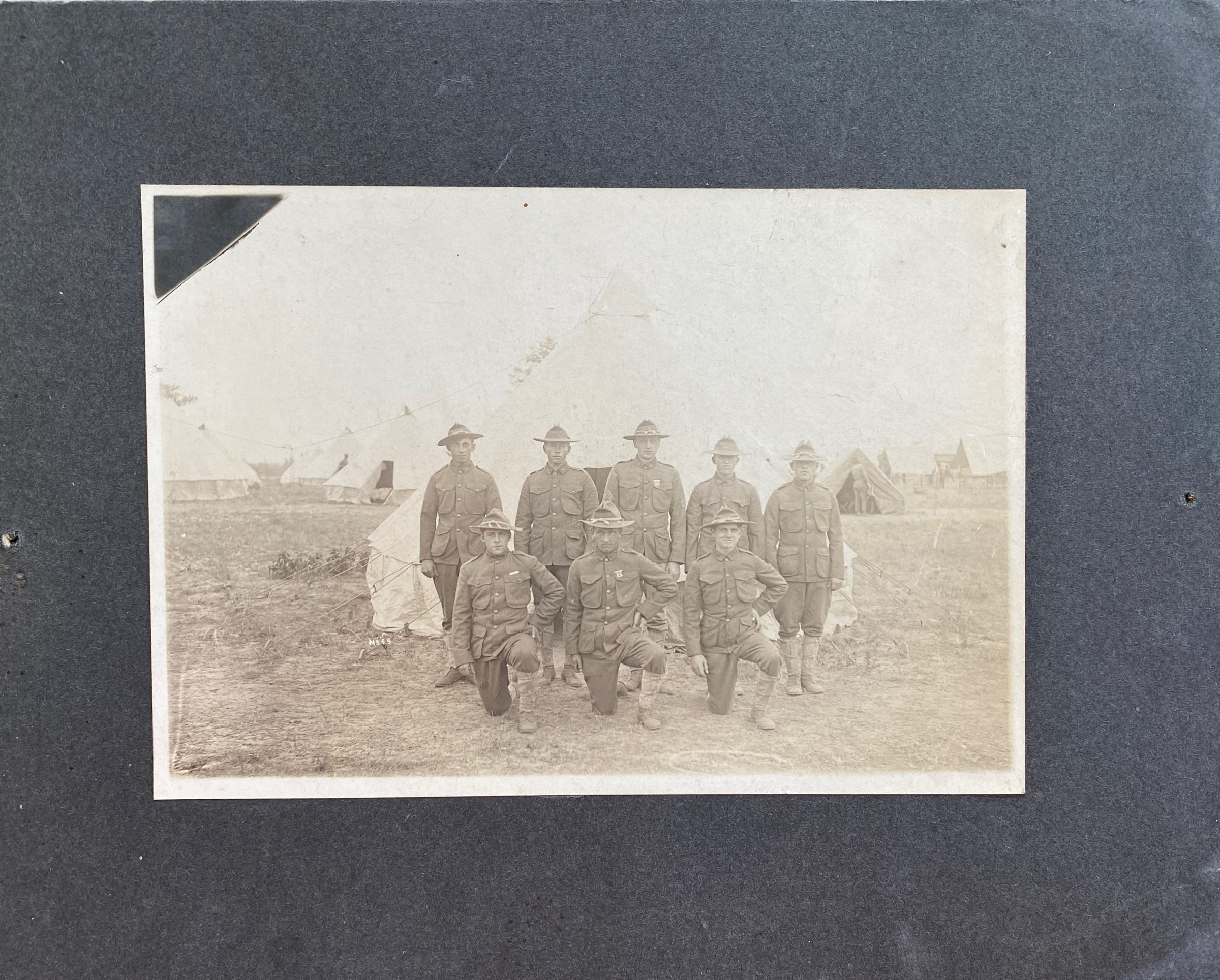 This is another photograph of Traill County, ND, National Guard Company L soldiers at a training camp, This photograph from the Palmer Rudrud collection was not labelled on the back but was likely taken at Camp Bruce McCoy training camp located in Sparta, WI, in August 1910 when other photos in this collection were taken. Arthur Sorum is standing at far left.Cataloged By