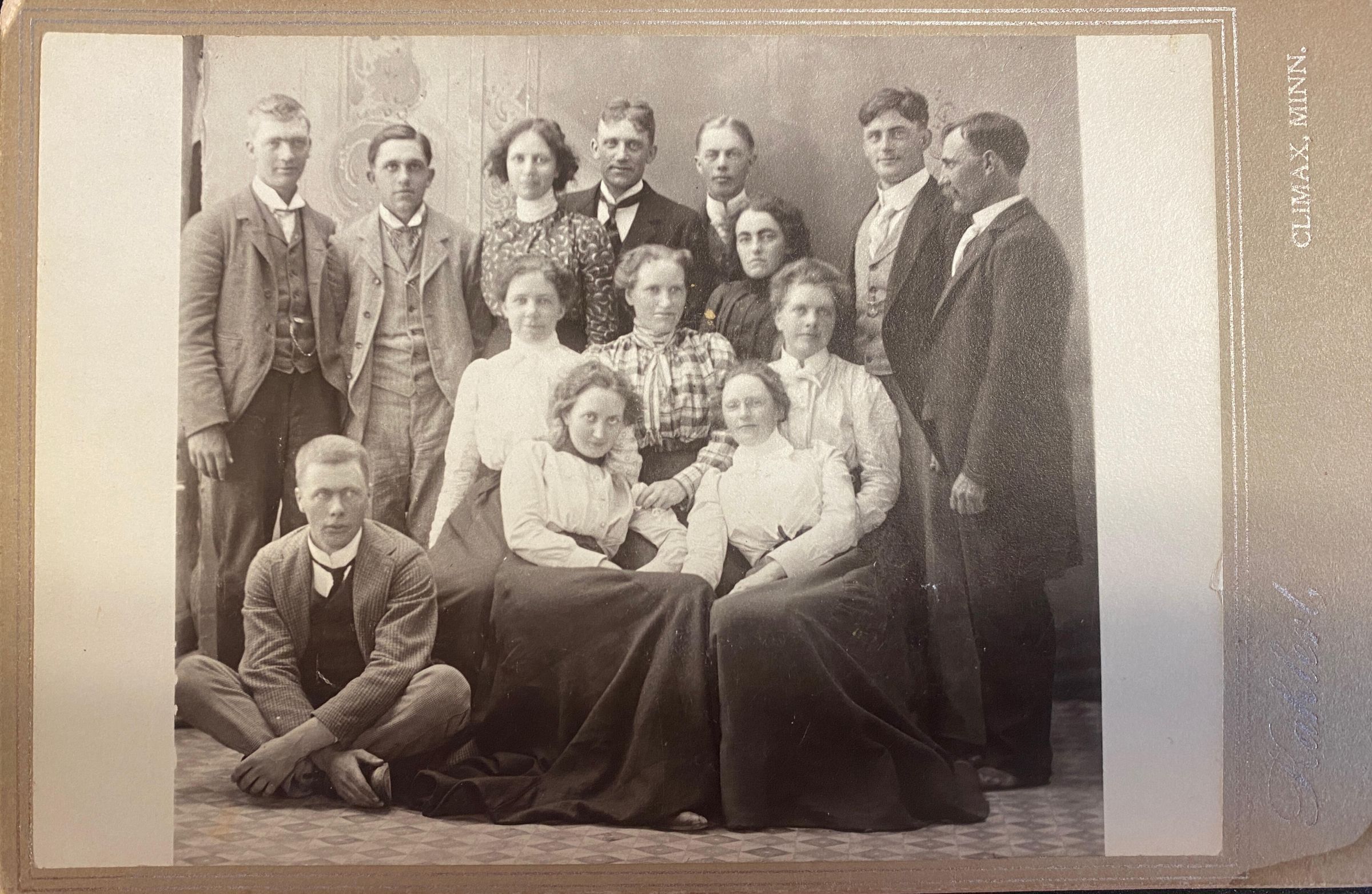 Group of 14 young men and women - back says from Buxton - front says Climax, Minn.Cataloged By