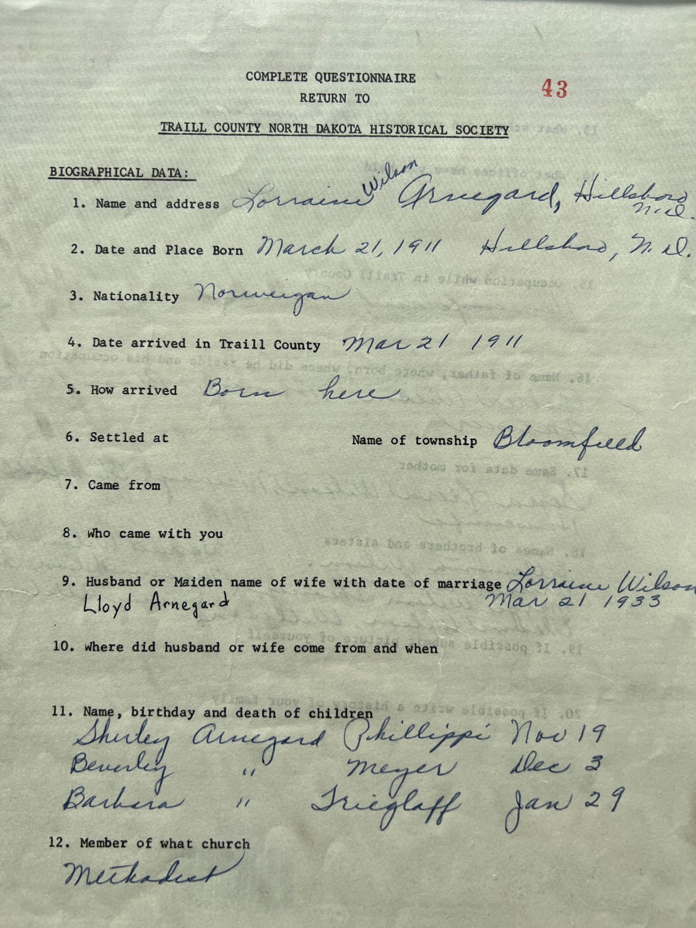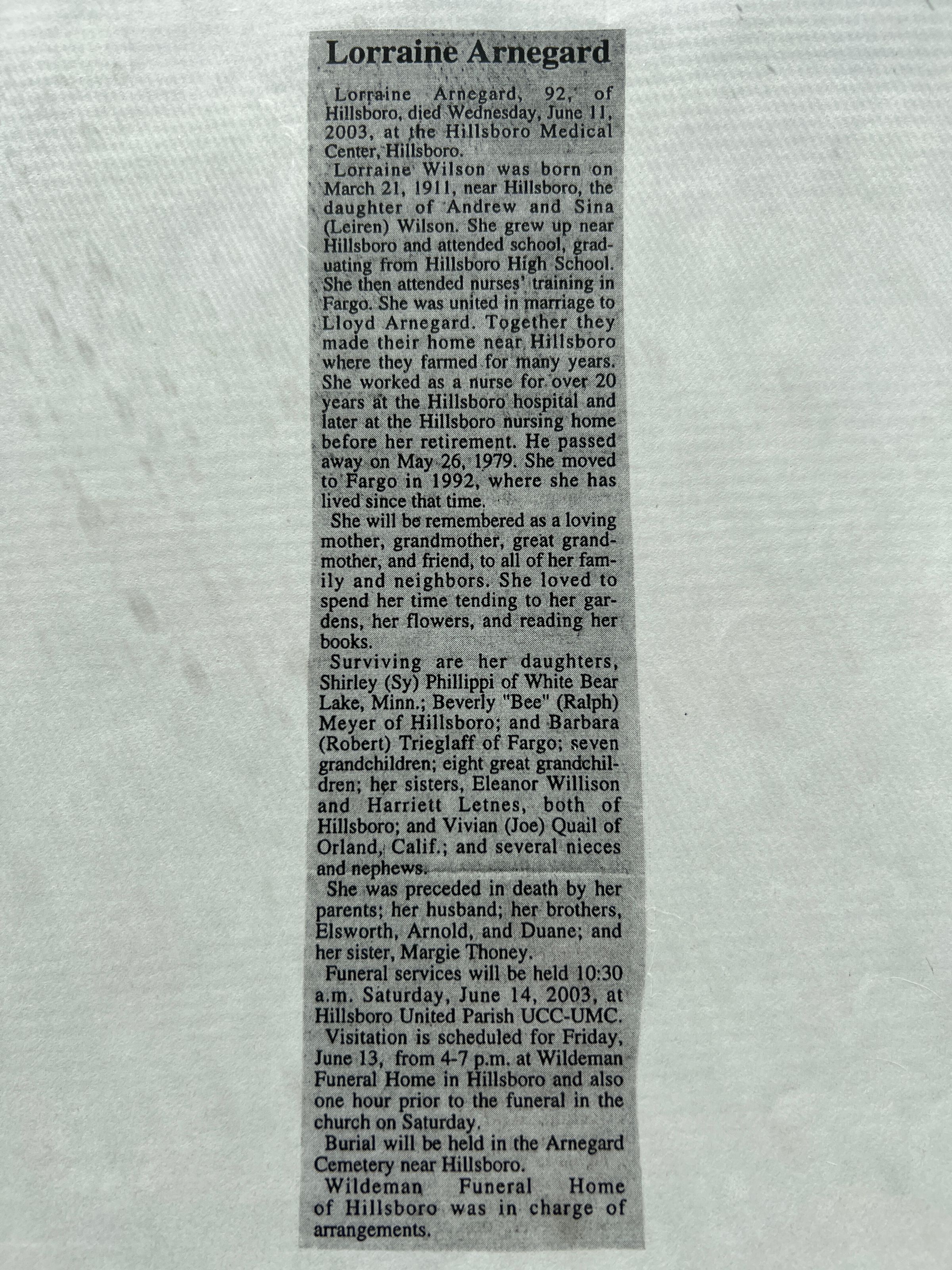 A folder of information on the life of Lorraine Wilson, who was born on 21 March 1911 in Hillsboro, ND, to parents Andew and Sena (Liern)Wilson,, Bloomfield Township farmers. Lorraine Wilson married Lloyd Arnegard on 21 March 1933. They had three daughters, Shirley, Beverly and Barbara Arnegard.