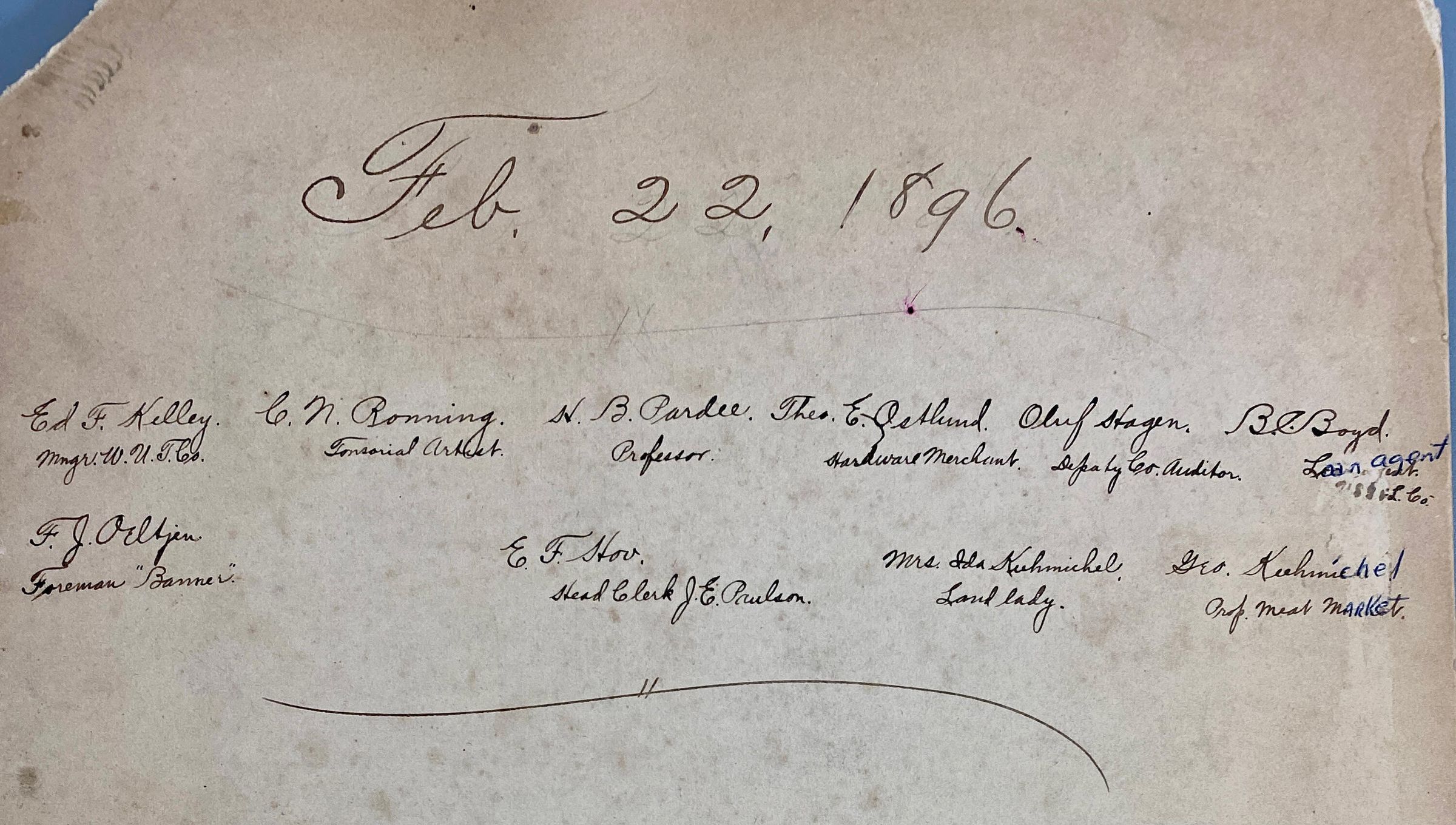 Ferdinand J. Oeltjen, Elias F. Hov, C. N. Ronning, Barney Boyd, Theo E. Ostlund, Ed F. Kelley, Ida Kuhmichel, H. B. Pardee, Oluf Hagen, George Kuhmichel
