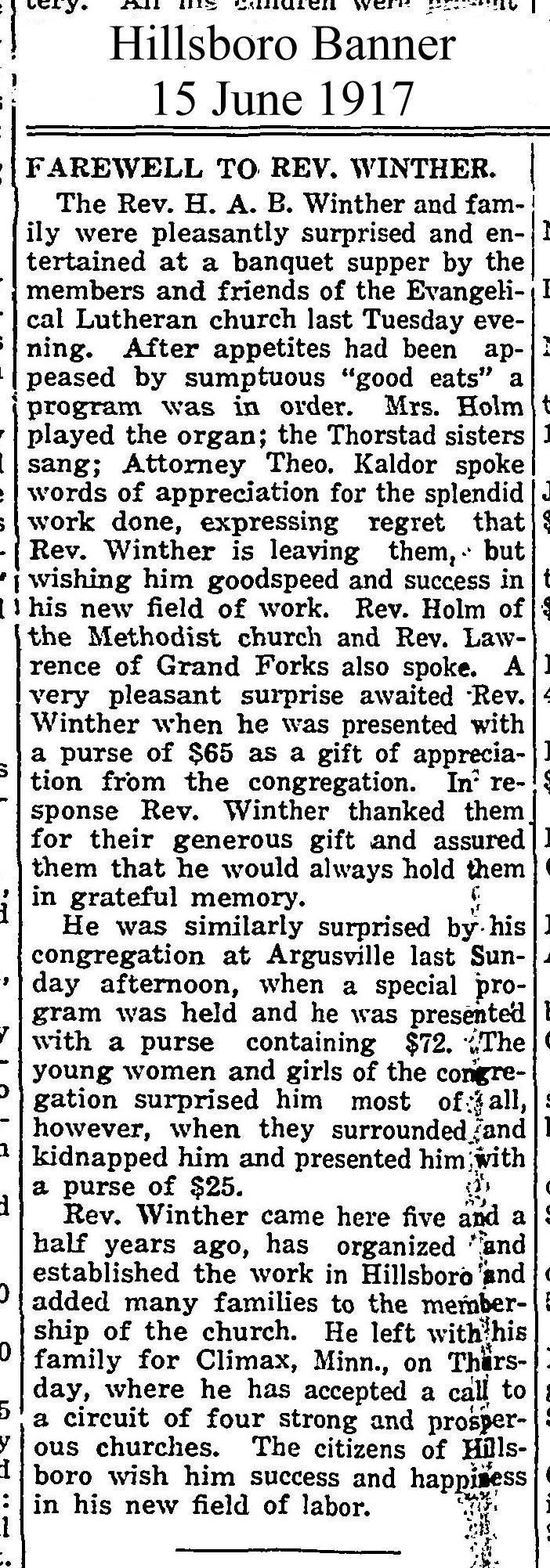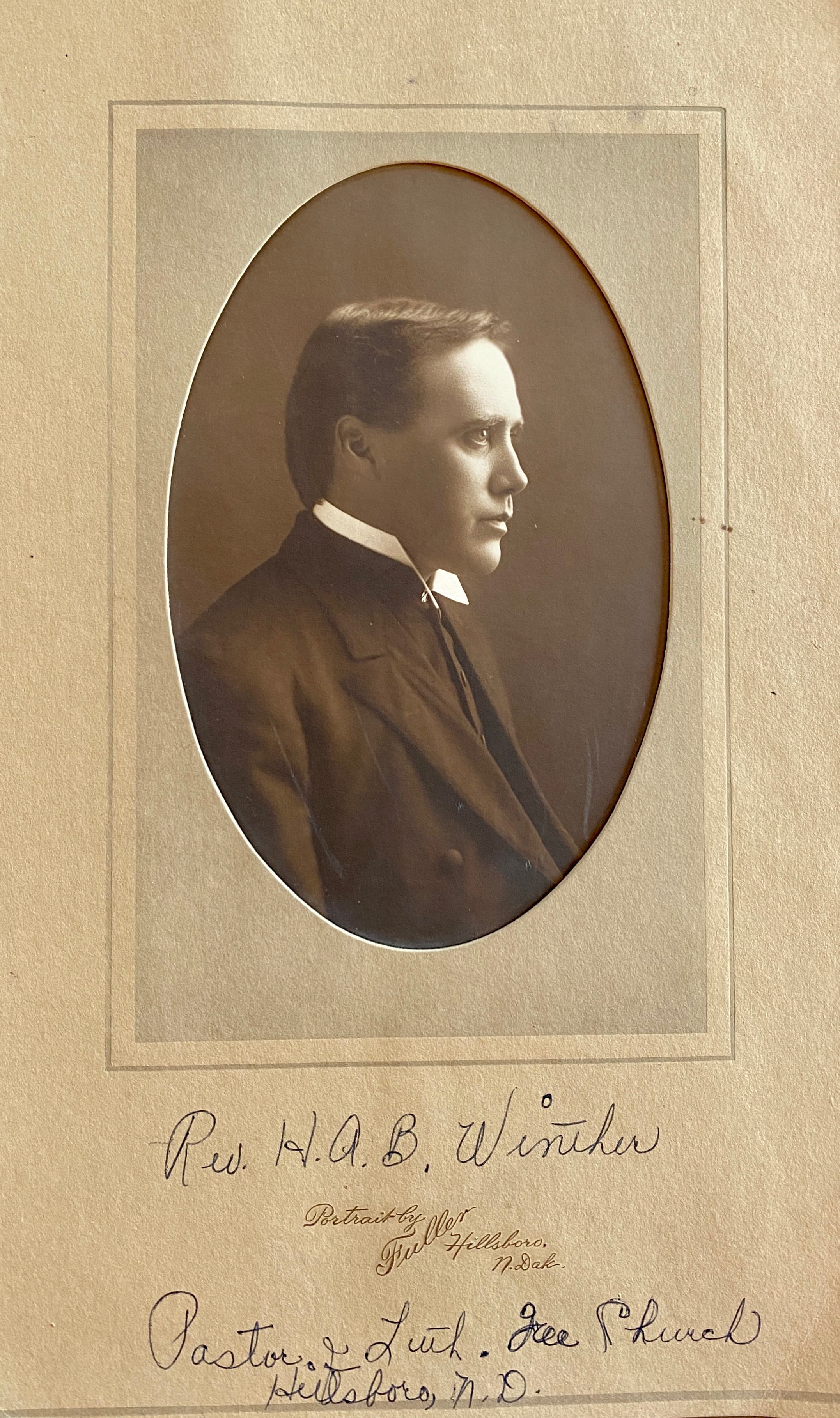 Rev. H. A. B. Winther, Pastor of the Lutheran Free Church, Hillsboro, ND. Rev. Winther served the Evangelical Lutheran Church in Hillsboro from 1911 to 1917, leaving after accepting a call to a church in Climax, MN. In 1912, Rev. Winther was also serving as pastor of AAL's Church in Norway Township when it held it 40th anniversary on 10 August, as reported in the Hillsboro Banner. In 1936, the Lutheran Free Church building in Hillsboro was sold to St. John Lutheran Church, which moved into Hillsboro from its rural church location in Bohnsack Township.Cataloged By