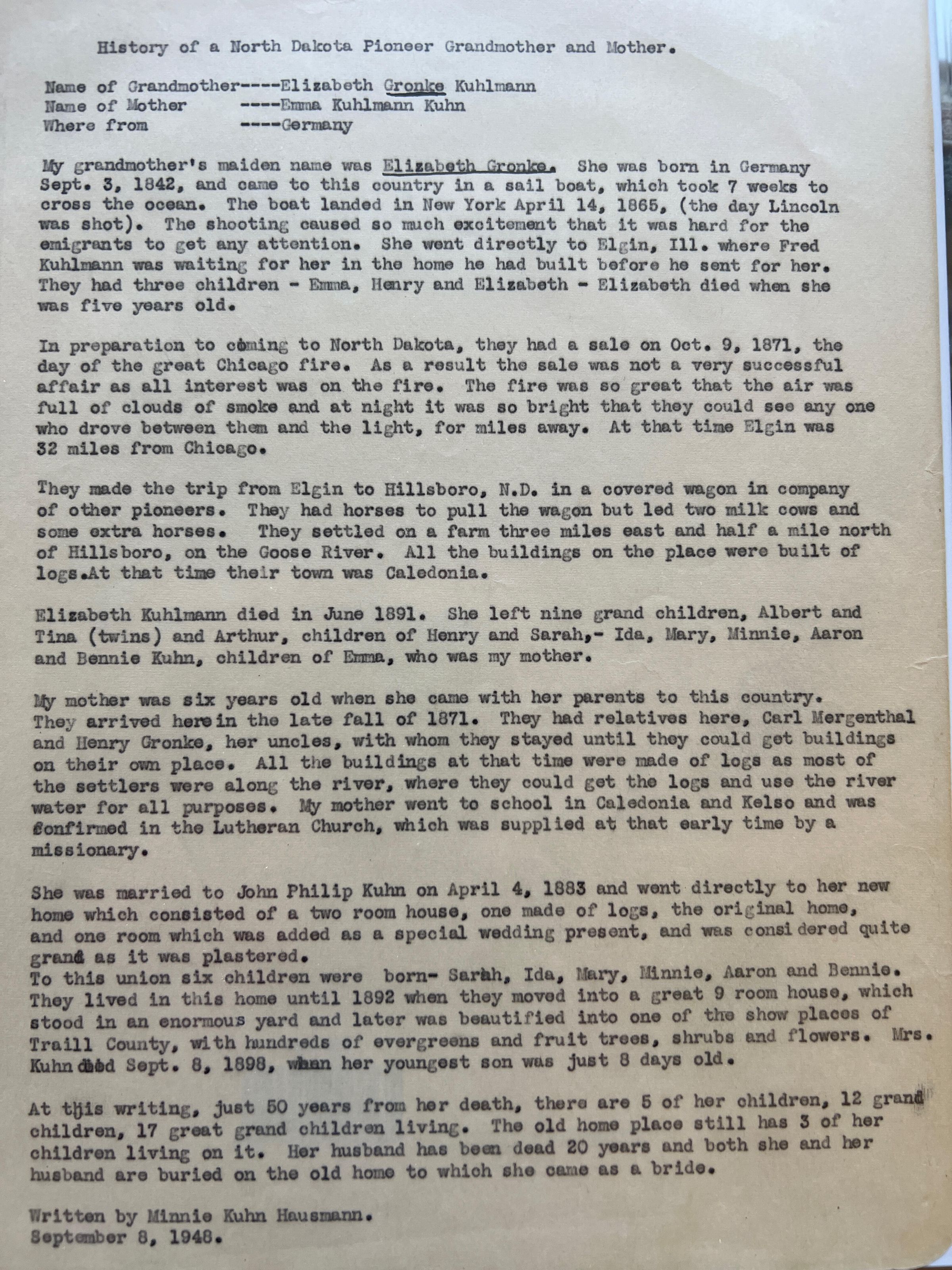 This folder includes a one-page biography of Elizabeth (Gronke) Kuhlmann, who came to Traill County in 1871, as written by her granddaughter, Minnie Kuhn Hausmann in 1948. Minnie's uncle was Henry Gronke.