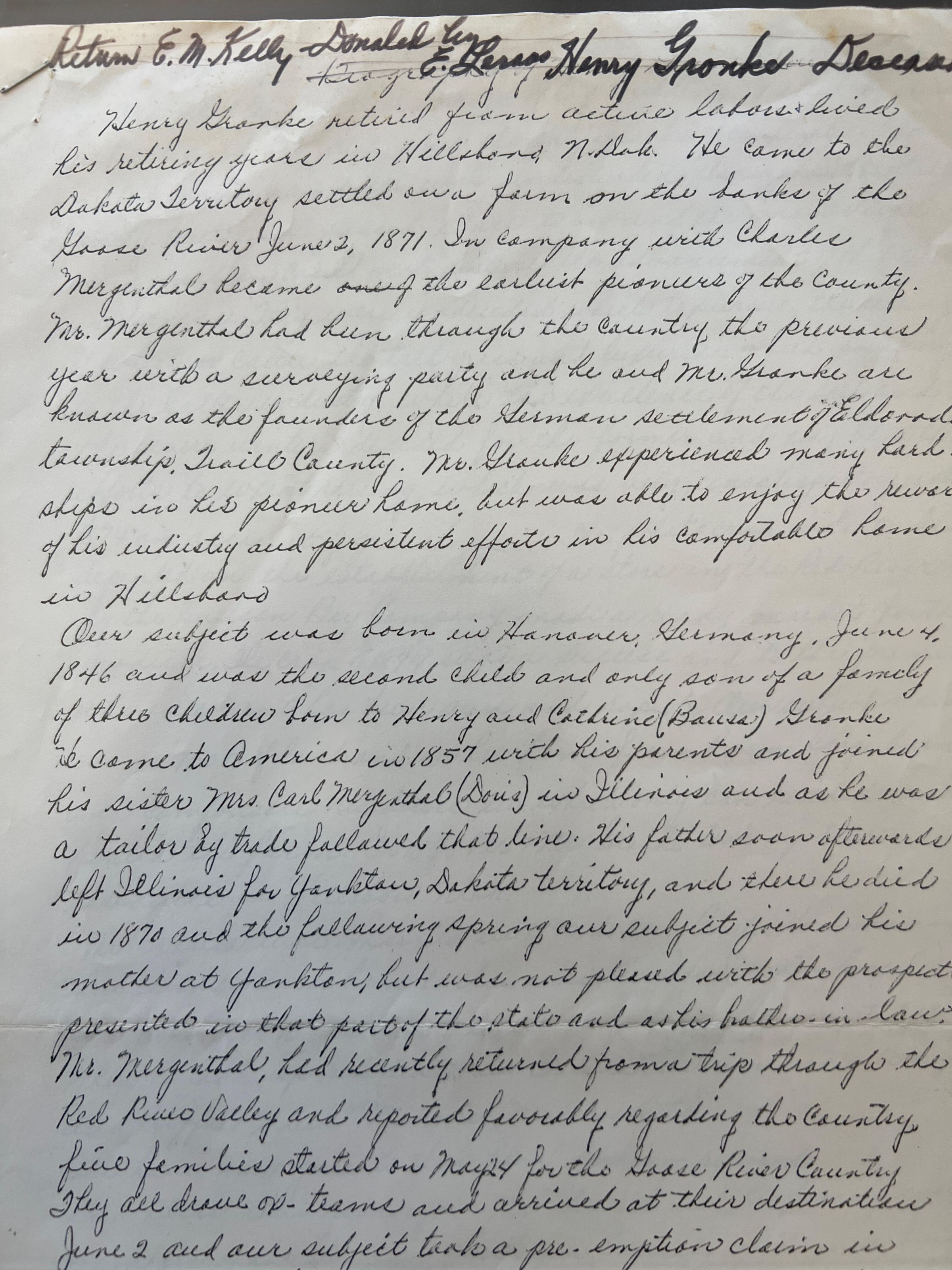 This folder also includes a two-page biography on Henry Gronke contributed by Edna Leraas. Henry Gronke came to Dakota Territory in 1871 and settled on a farm on the banks of the Goose River in Eldorado Township in the company of Charles Merganthal.Cataloged By