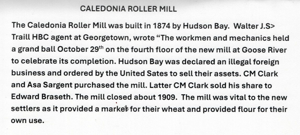 John Wright has compiled information about the Caledonia Roller Mill ( see below). Briefly, it was built in 1874 by Hudson Bay Company. It was located on the Goose River. When Hudson Bay was declared an illegal foreign business, CM Clark and Asa Sargent purchased the Roller Mill, which closed in 1909.Photograph Details