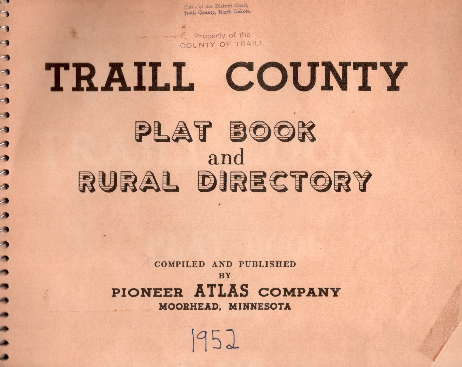 The spiral-bound Atlas for Traill County, published in 1952, includes Township plat maps and a rural directory by name, PO Address, Township location, and whether land was owned or rented.Cataloged By
