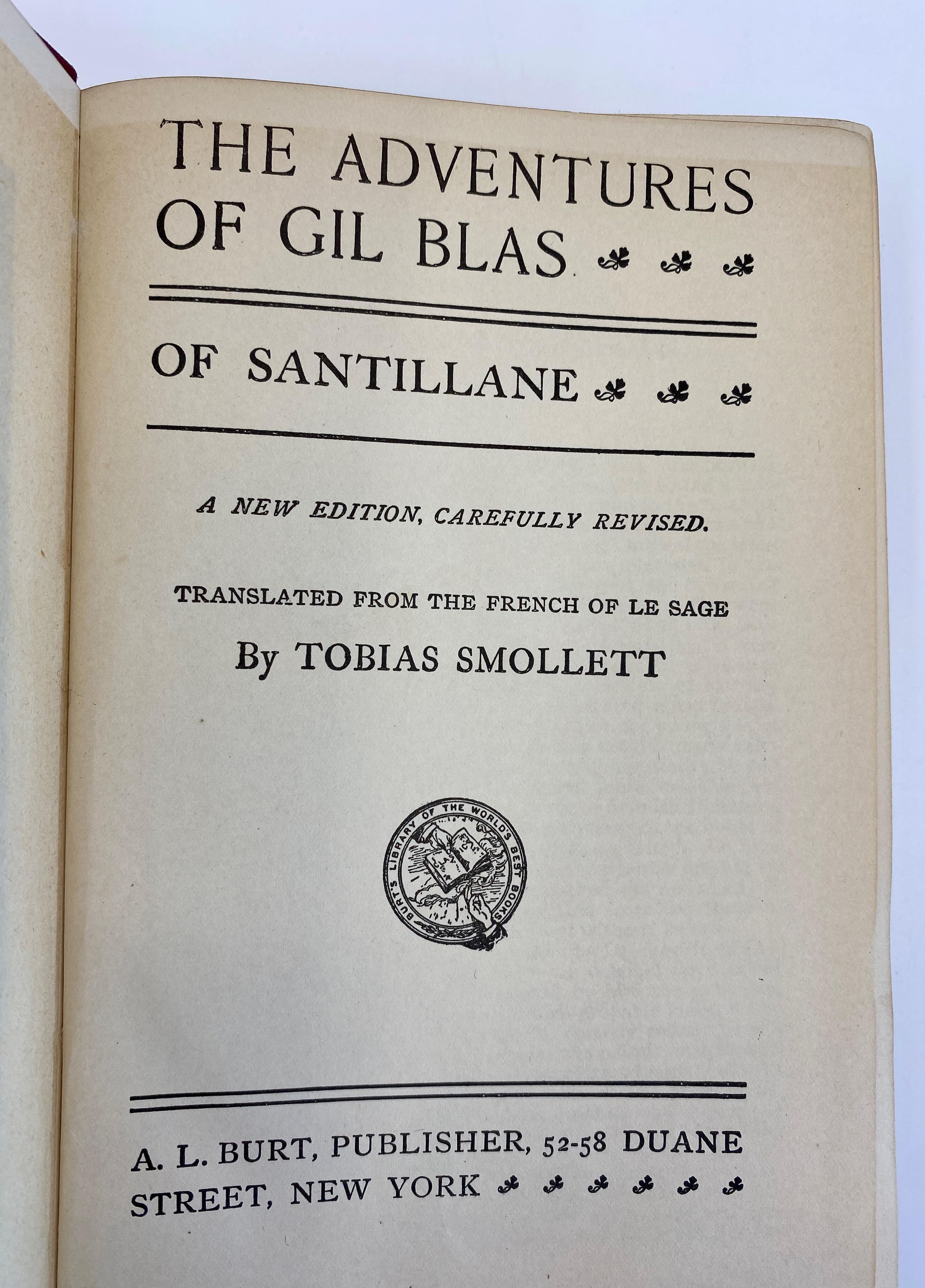 The Adventures of Gil Blas of Santillane by Alain-Rene Le Sage, and a new, revised edition translated from French by Tobias Smollett. Published by A. L. Burt Publisher, New York, NY. Located in Lillie Plummer's Personal LibraryCataloged By