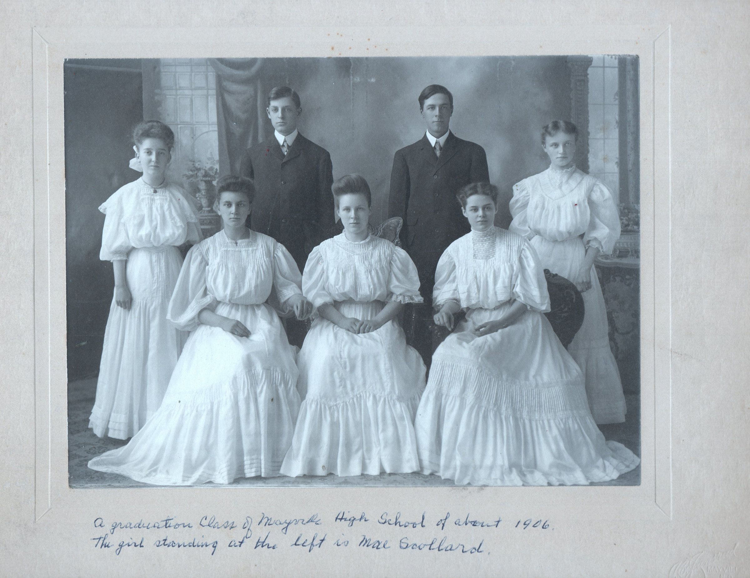 In 1906, the third graduating class of Mayville High School included seven students: Perry Arnold, Nettle Bell, Lottie Morrish, Solveig Olson, Nora Peterson, Mae Scollard, and Harold White, as shown in Class of 1906 photography at left. The girl at standing at left is known to be Mae Scollard.Acquisition