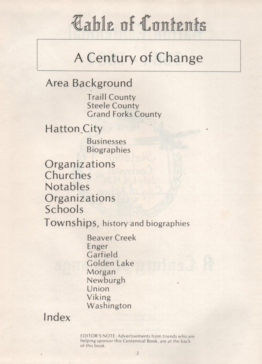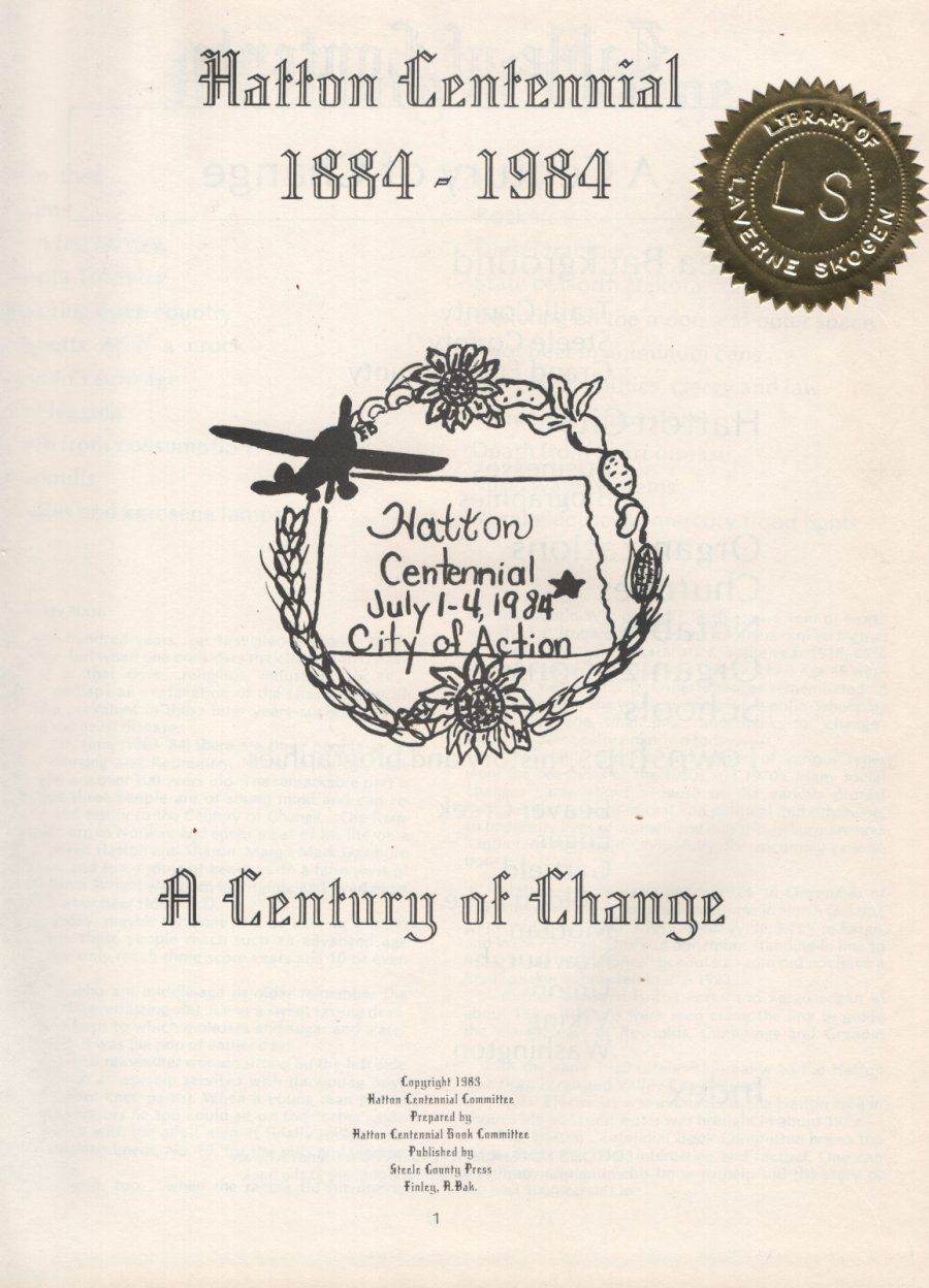 In 1984, the City of Hatton, ND, celebrated its Centennial (1884-1984). For this celebration, a 9" by 11", 416-page, dark-brown book titled: "Hatton Centennial 1884-1984, A Century of Change" was prepared by the Hatton Centennial Book Committee. This book includes a number of chapters, for example, on the History of Hatton City and the Area, Townships, and Families (see book Table of Contents, below).