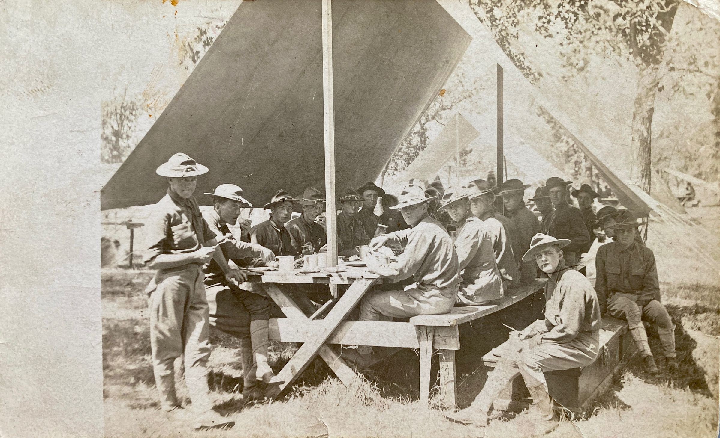 Traill County, ND, National Guard Company L under tent at Camp McCoy, Sparta, WI. Postcard dated 26 August 1911.Context