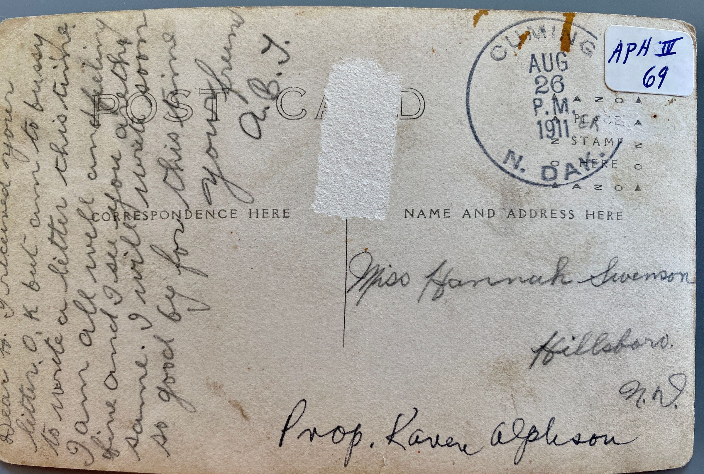 A postcard photograph of Traill County, ND, National Guard Company L under a tent at Camp McCoy, Sparta, WI. Postcard dated 26 August 1911. Postcard from the Palmer Rudrud Collection. The postcard was written to 19-year-old Miss Hannah Swenson (my grandmother) by ABJ. Jack LudwigCataloged By