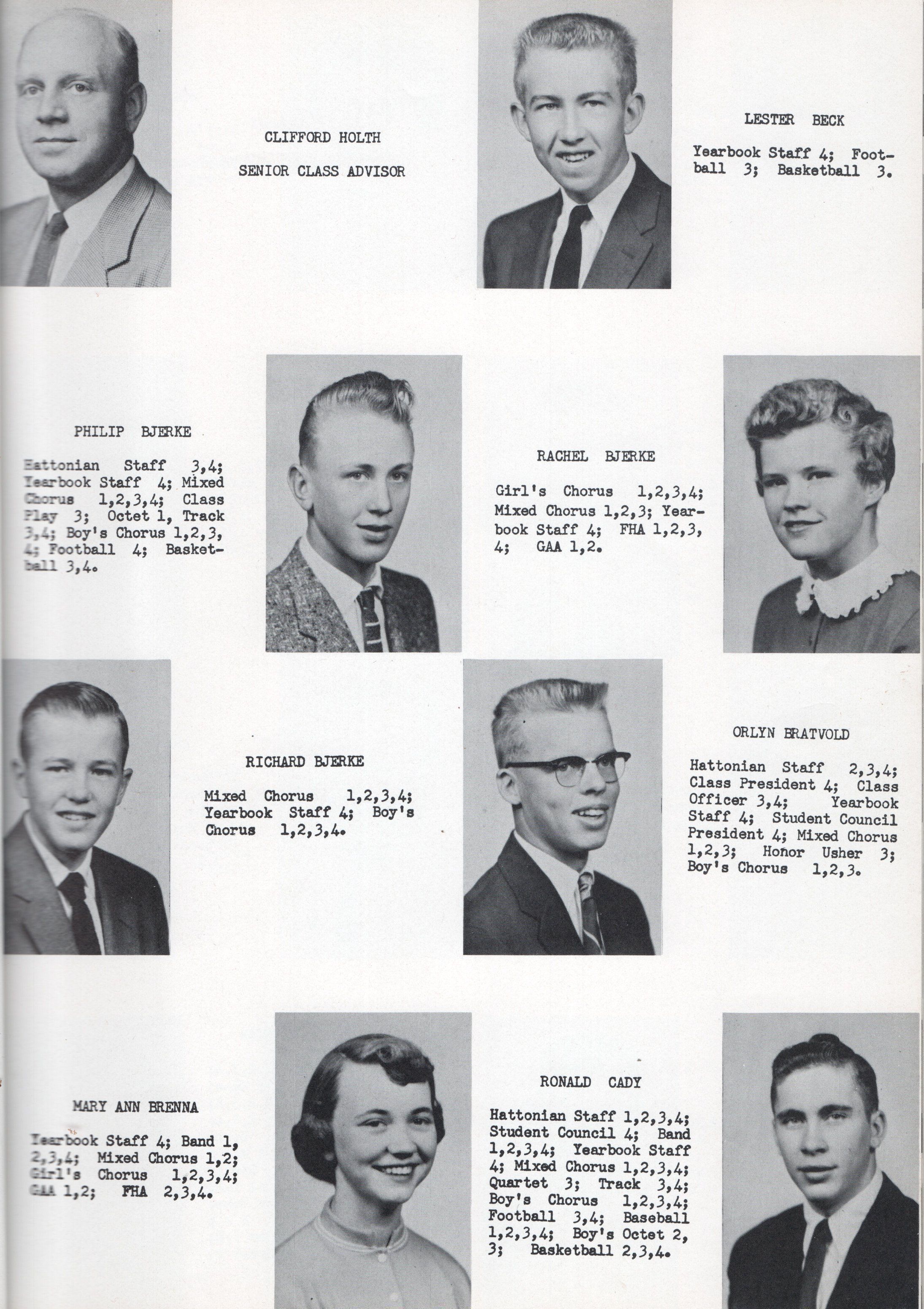 The 1956 yearbook includes four pages of Senior student photographs for: Eugene Lester Beck, Philip Bjerke, Rachel Bjerke, Richard Bjerke, Orlyn Bratvold, Mary Ann Brenna, Ronald Cady, Lois Ann Enger, Sharon Draper, Orville Fillbrandt, Eunice Goughnour, Barbara Grande, Dale Gulson, Raymond Hanson, Beverly Hofstad, Donald Huus, Keith Iverson, Mary Mastrud, Marilyn Meldahl, Clayton Ness, Ardell Olson, Arlene Olson, Shirley Olson, Joann Onstad, Lynn Skjoiten, David Soliah, Gerhard Sorlien, Carol Jean Staupe, Gayle Strand, Lois Ancile Thompson, and Lois Ione Thompson. Not Pictured: Carroll Beck