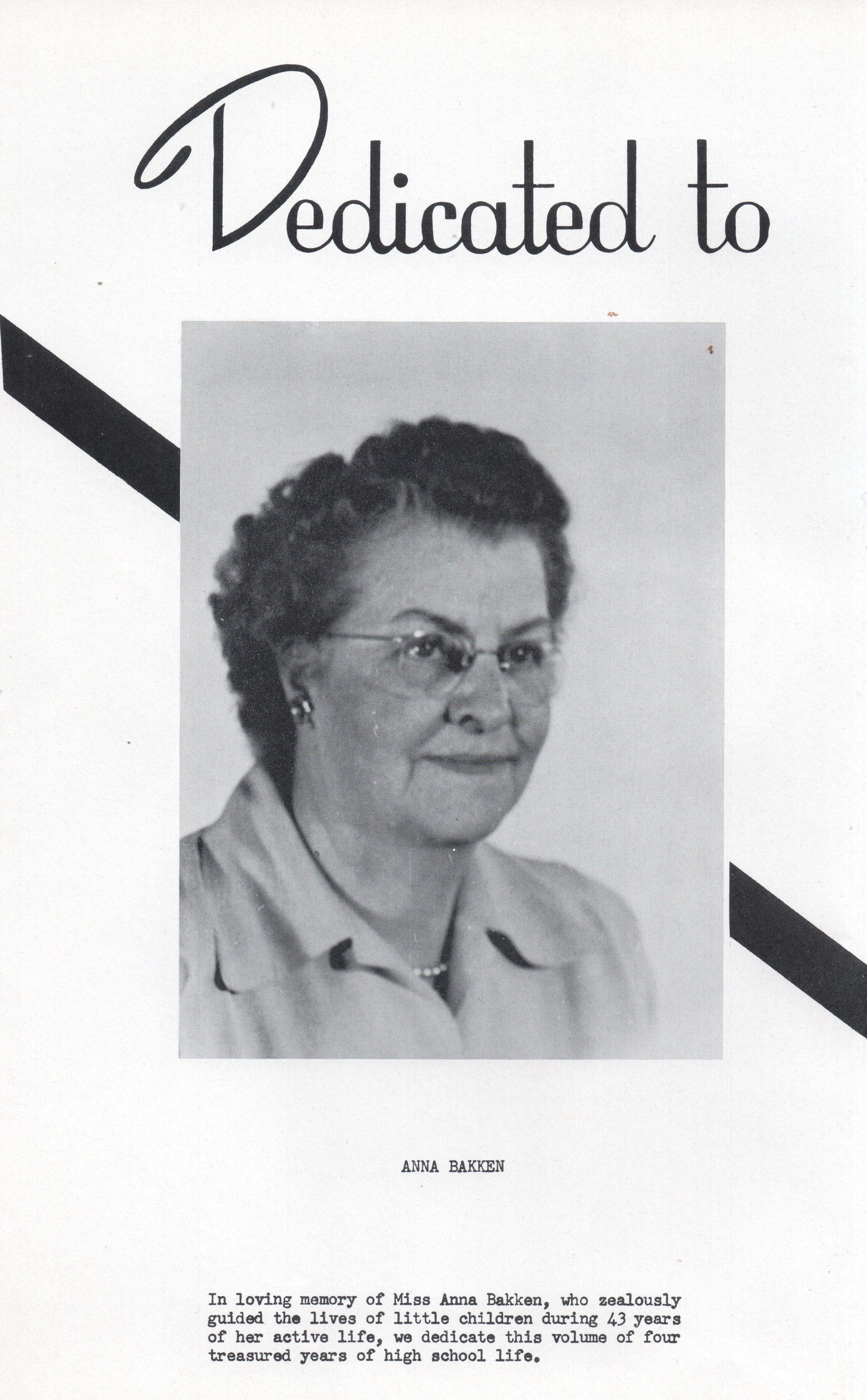 The Class of 1956 Hatton High School Yearbook, titled The Hattonian '56, was dedicated to Miss Anna Dakken, teacher.