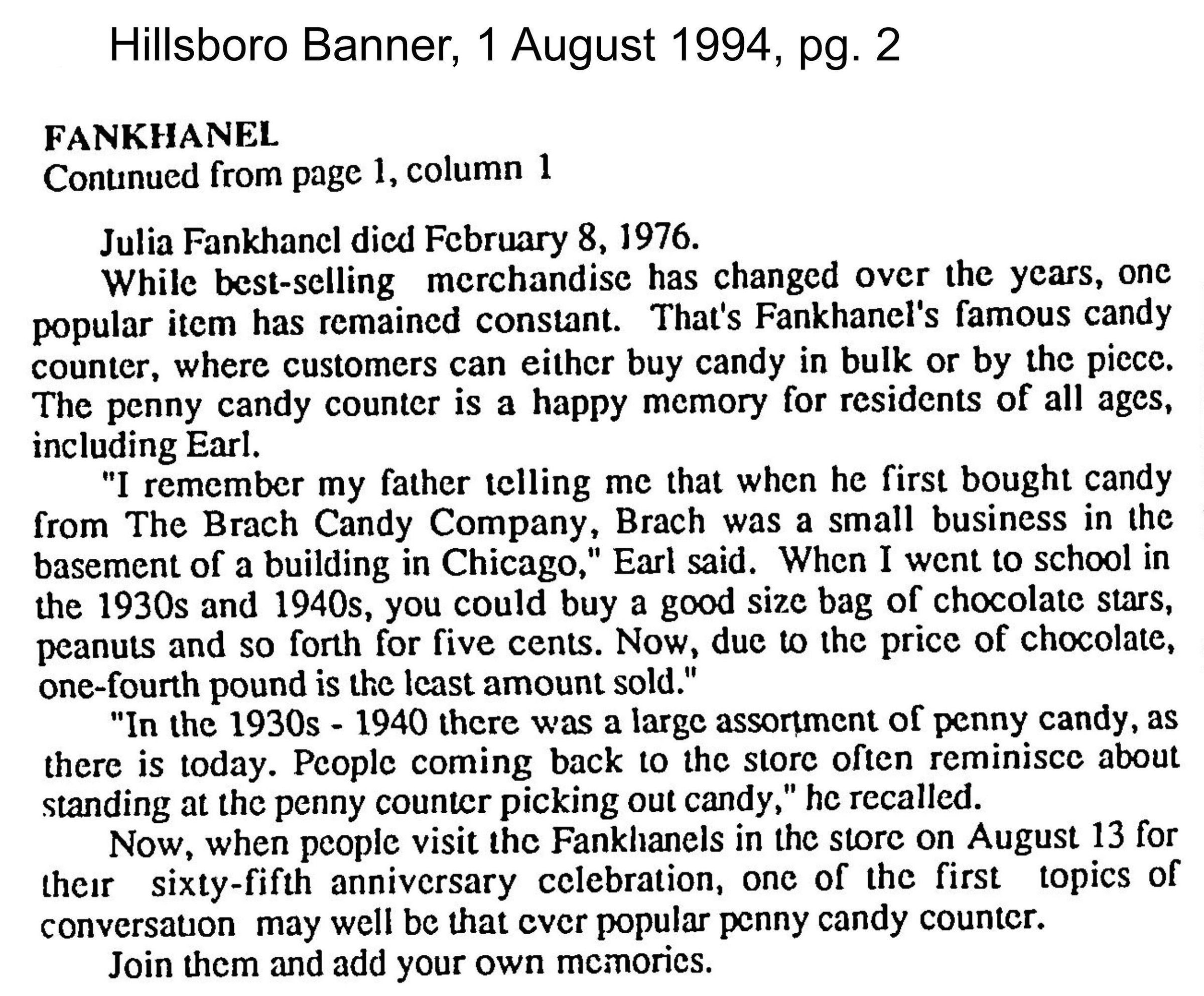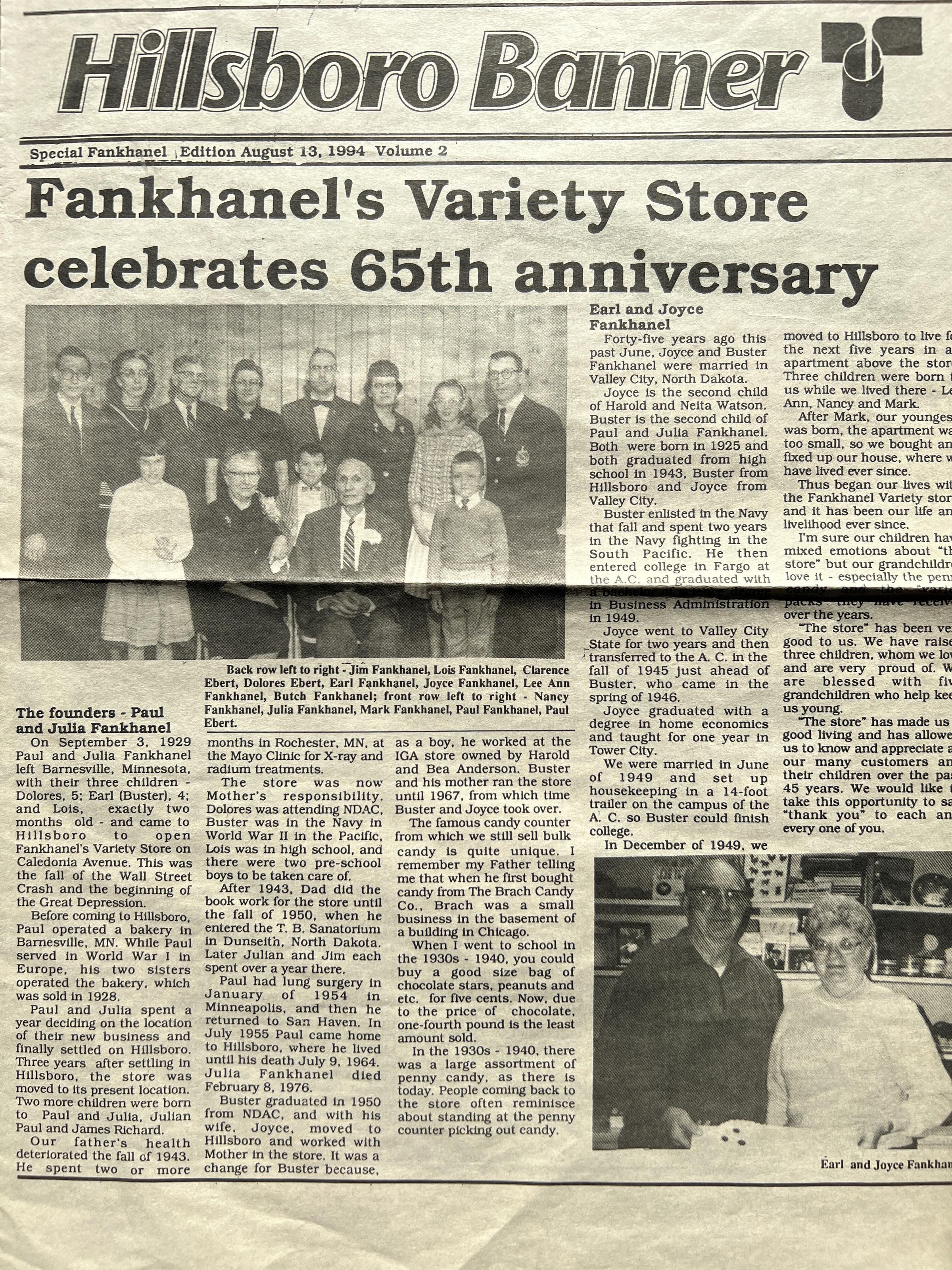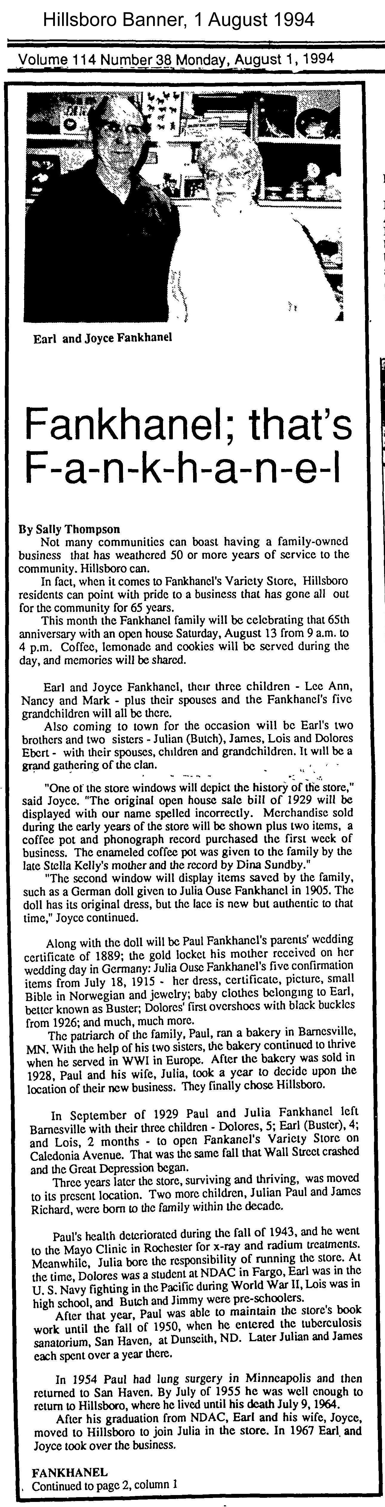 Other Hillsboro Banner articles about the Fankhanel variety store were published on 12 Aug 1989 when the Fankhanel store celebrated its 60th anniversary, an article published on pages 1 and 2 in the 1 August 1994 issue (below). On 11 November 2002 the Hillsboro Banner published article by Bob Ludwig about Earl Fankhanel; Hillsboro Banner, 30 Jun 2006, article about Buster and Joyce Fankhanel. Then the Grand Fork Herald published an article on 26 June 1995 about closing of Fankhanel's variety store.Cataloged By