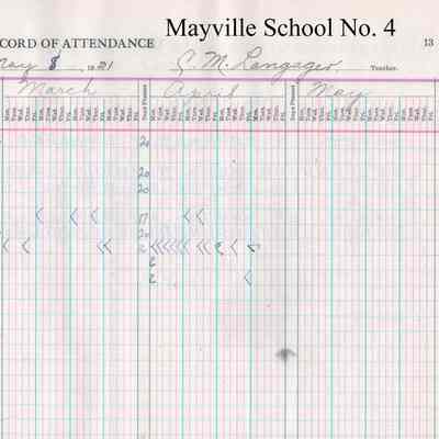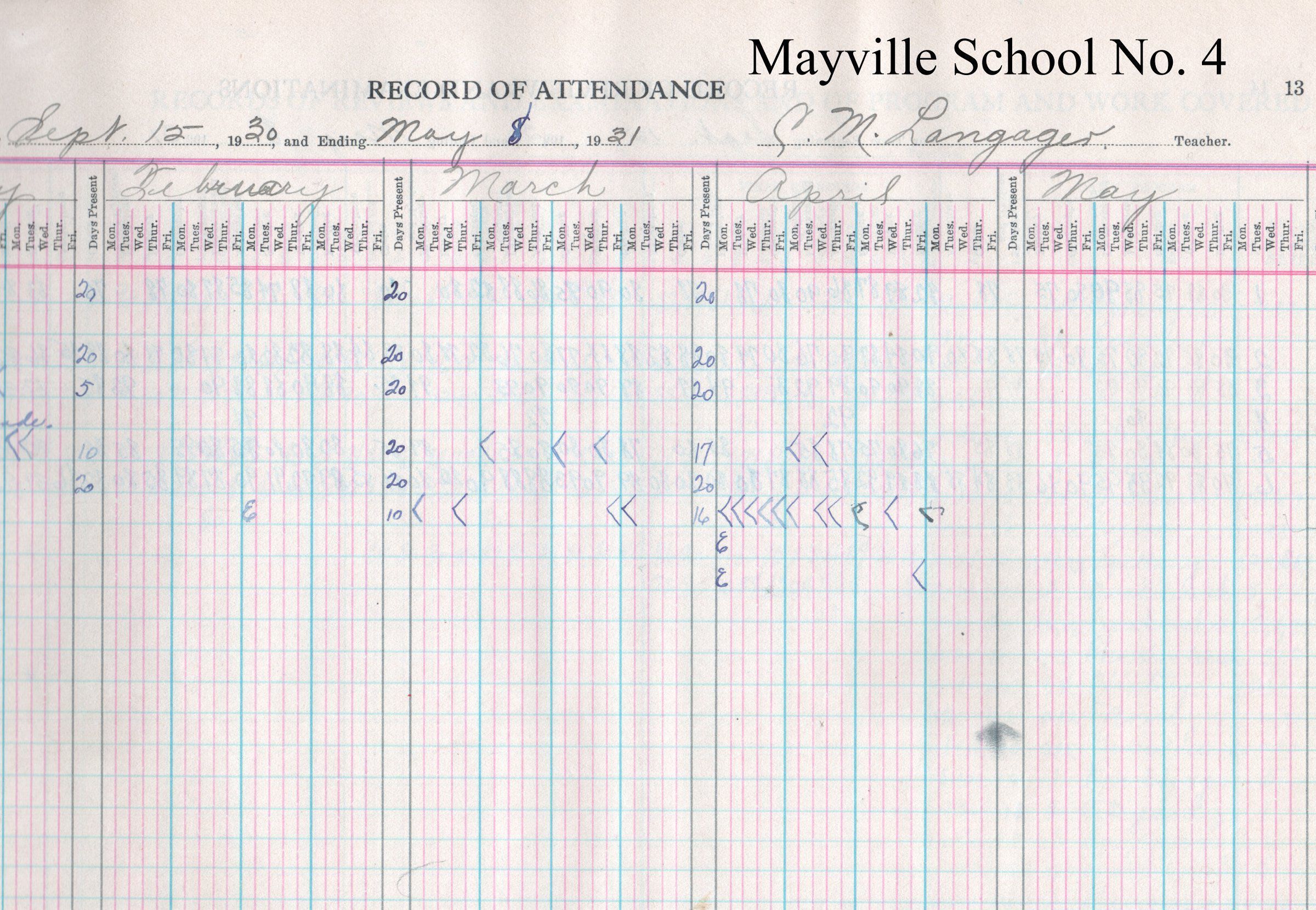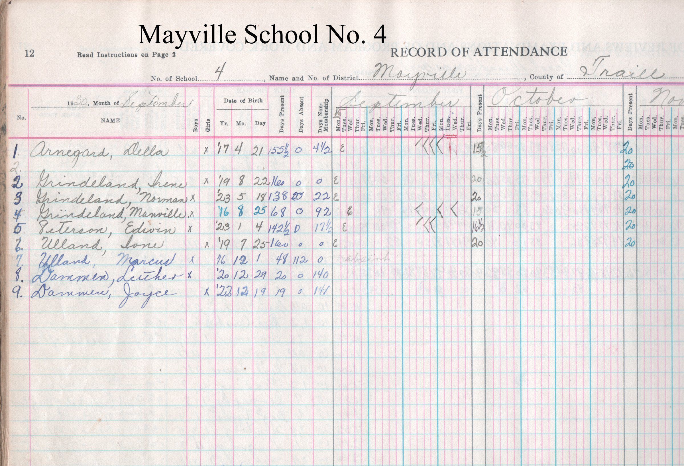 During the 1930-1931 school year, from September to May, Mayville School No. 4 teacher, Carol Mai Langager, kept attendance records for 9 students including Della Arnegaard, Joyce Dammen, Luther Dammen, Irene Grindeland, Manville Grindeland, Norman Grindeland, Edwin Peterson, Ione Ulland and Marcus Ulland.Acquisition