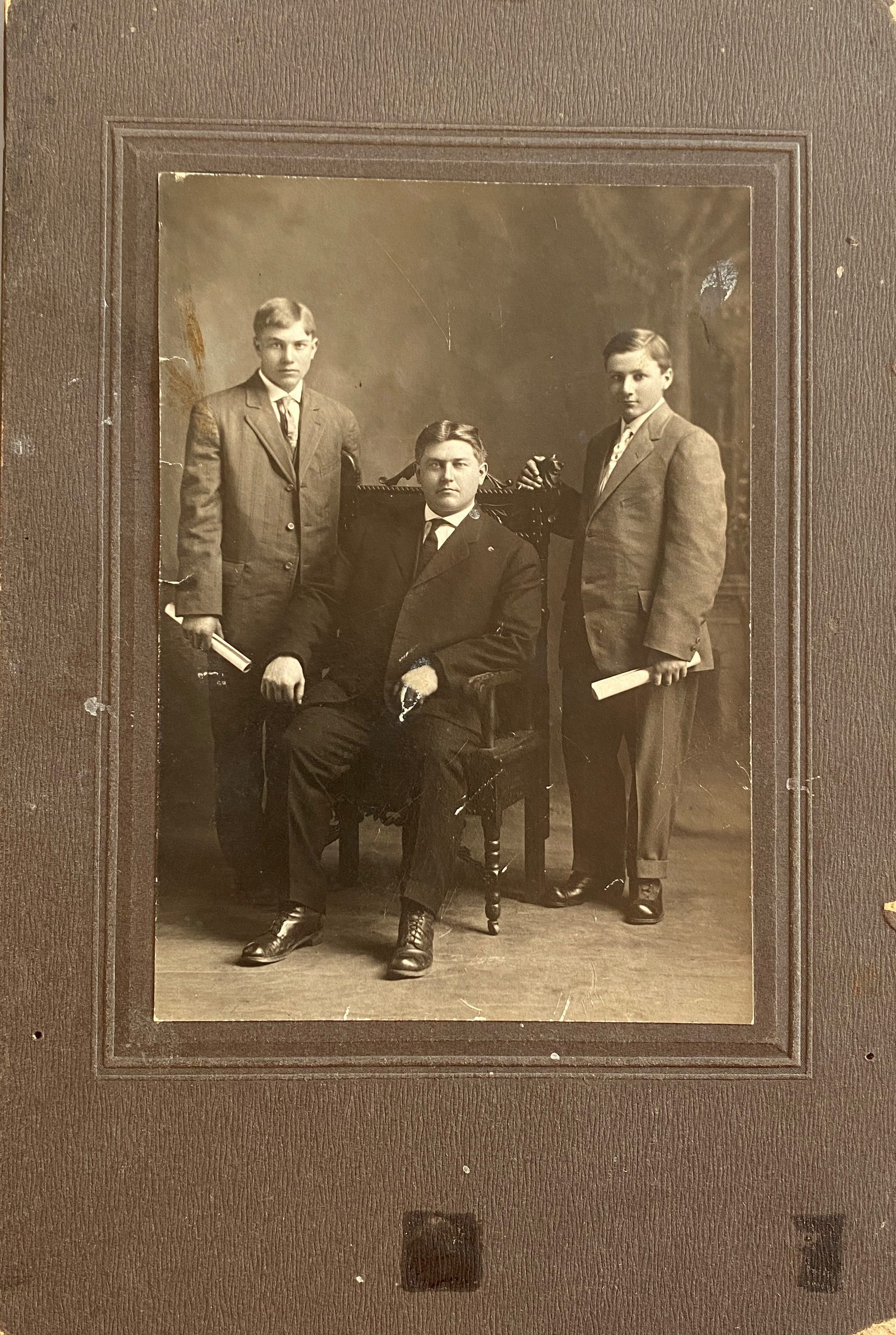 Immanuel Lutheran Pastor W. C. Hitzemann with Richard Kaufman & Henry Grohnke, confirmation class, 1914Photograph Details