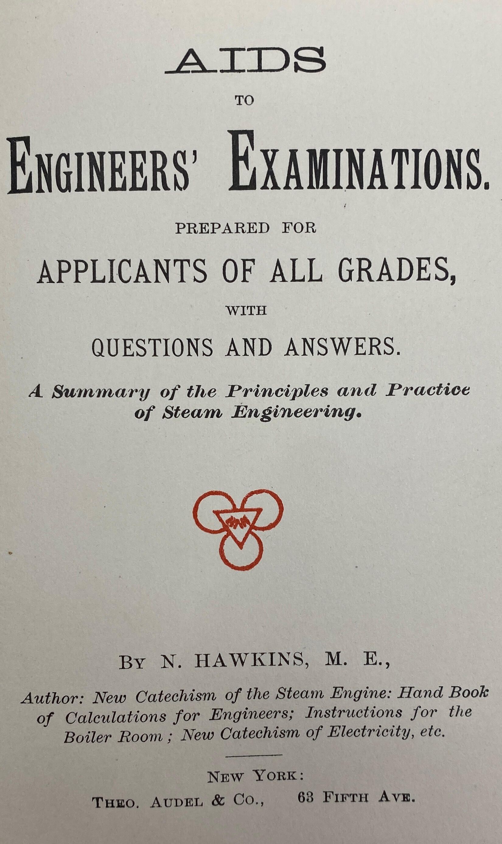 Engineers Examinations with Questions and Answers. Examinations prepared for applicants of all grades. Copyright 1901 by N. Hawkins, M.E., and published by Theo. Audal & Company, New York, NY.Cataloged By