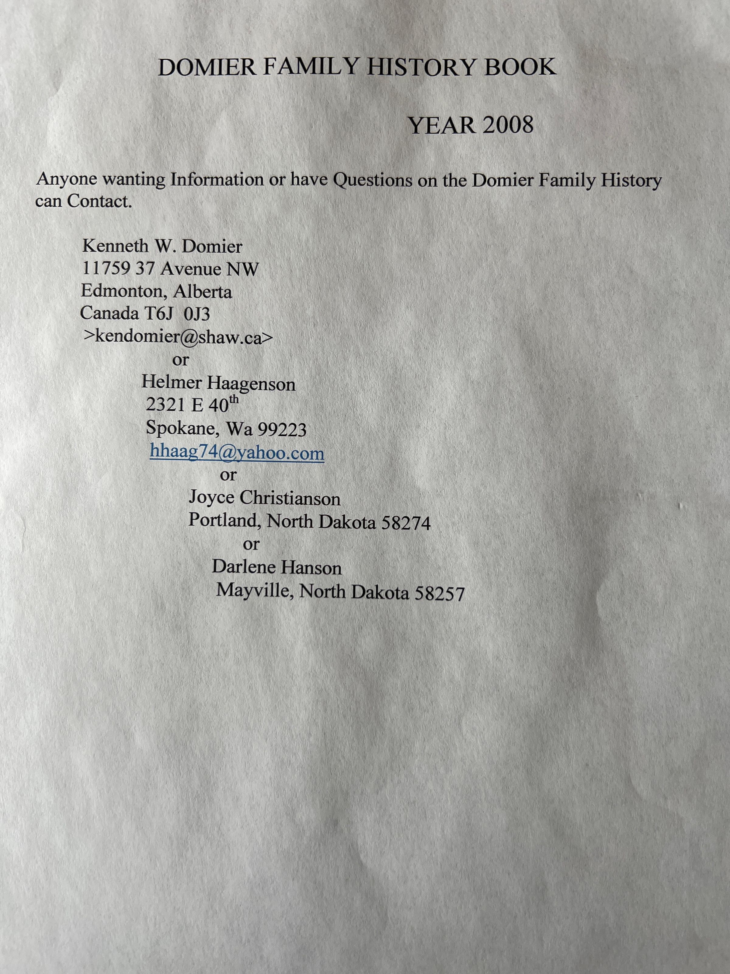 A file containing the Domier Family History Book (2008) on David and Anna (Richter) Domyer (Domier) and their descendants. The file includes contact details for where to get more information about this Domier family.Cataloged By