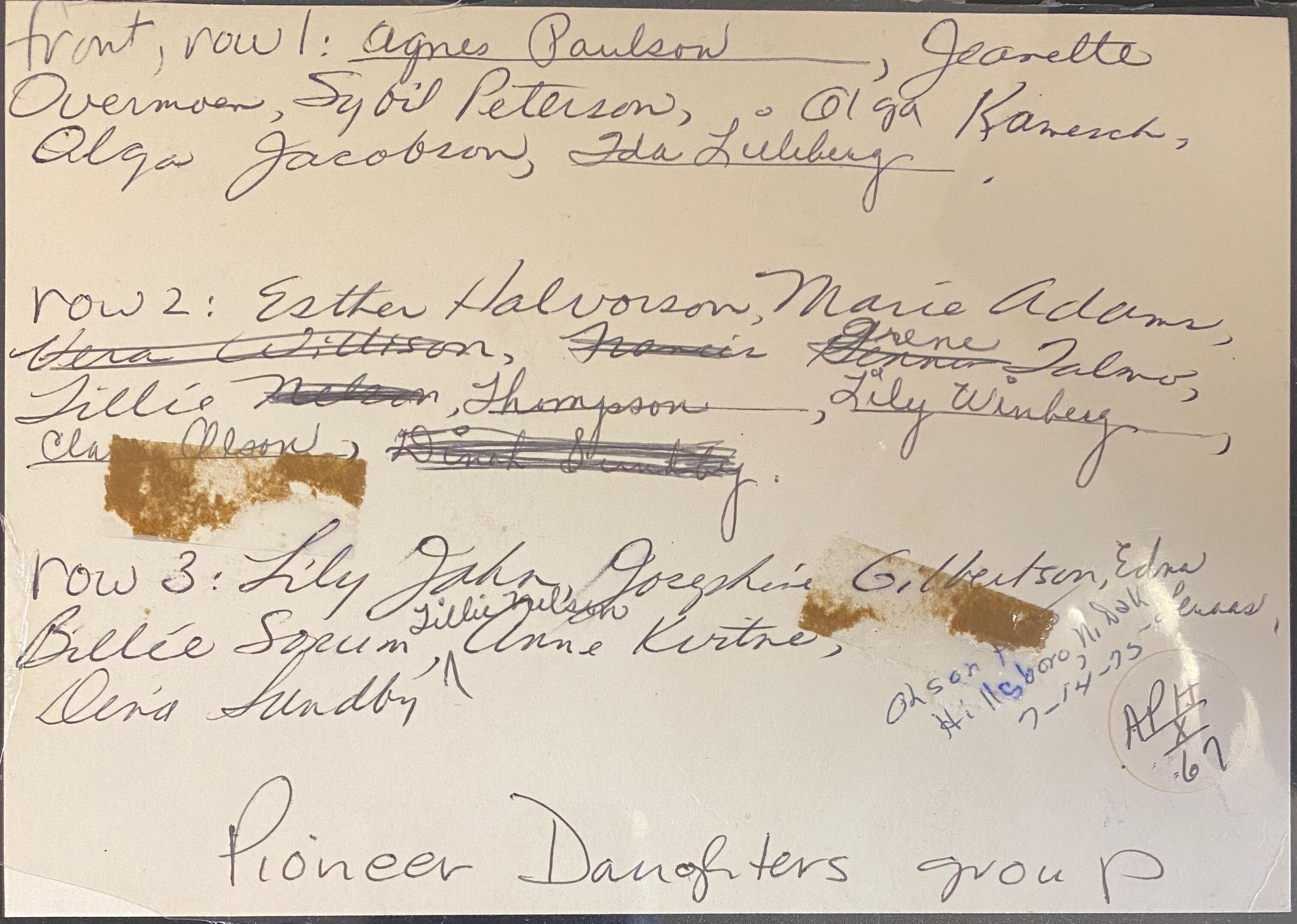 Olga Jacobson, Esther Halvorson, Pioneer Daughters, Irene Talmo, Lily Jahn, Marie Adam, Edna Leraas, Jeanette Overmoen, Tillie Nelson, Sybil Peterson, Billie Sorum, Ida Lilleberg, Lily Winberg, Anne Kirtne, Agnes Paulson, Olga Kamesch, Dina Sundby, Josephene Gilbertson