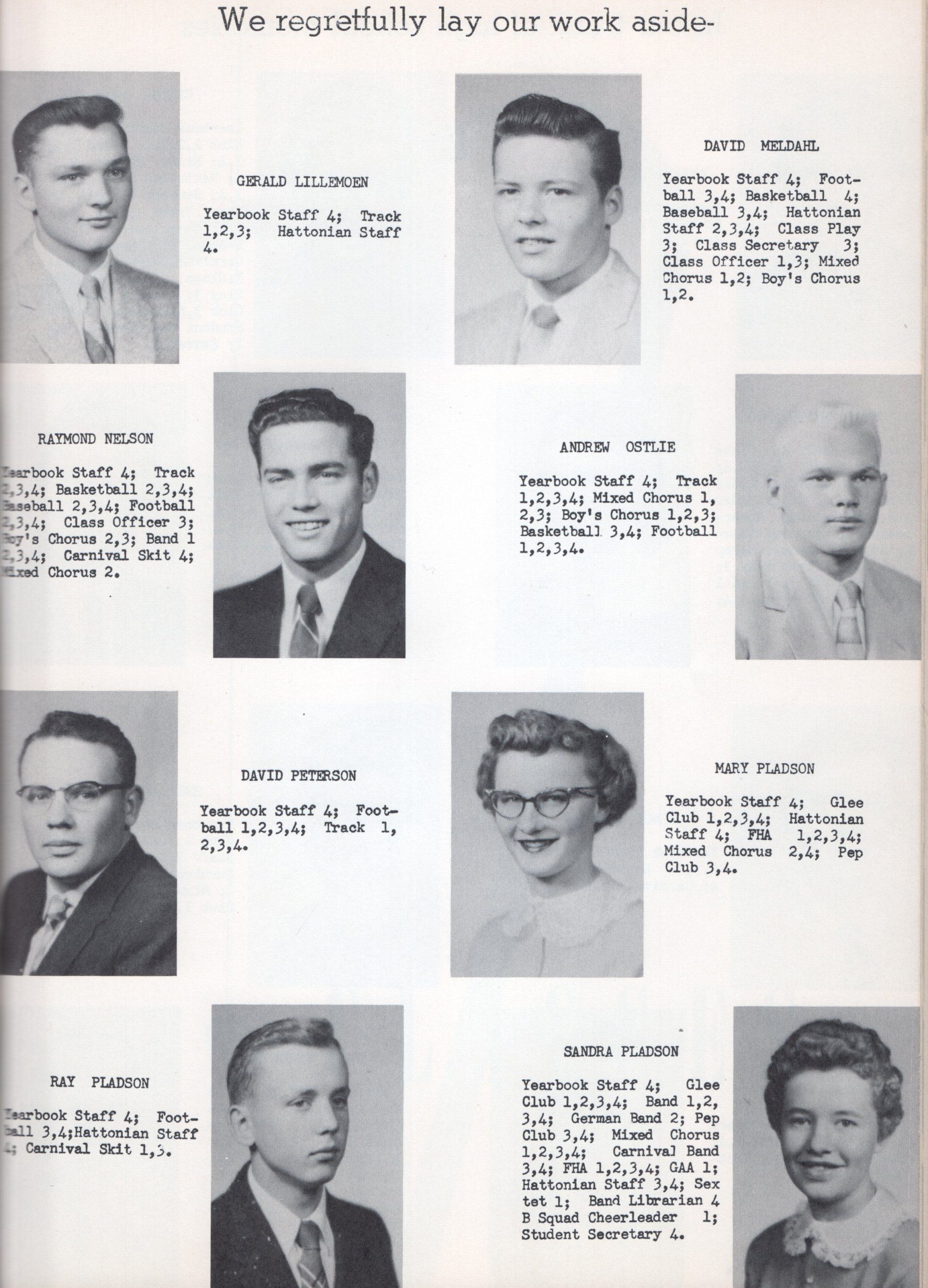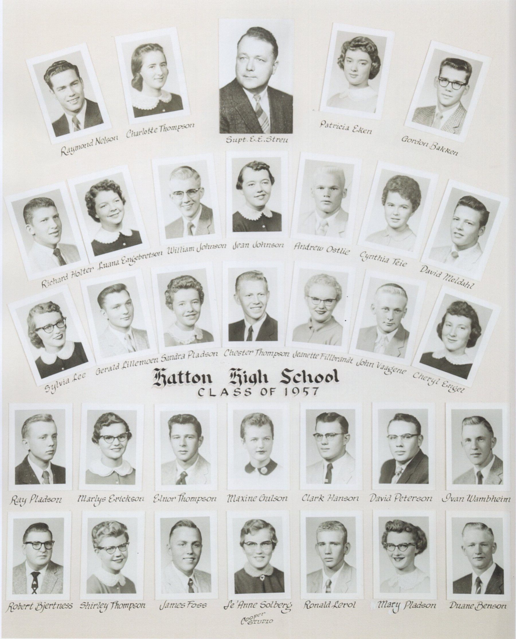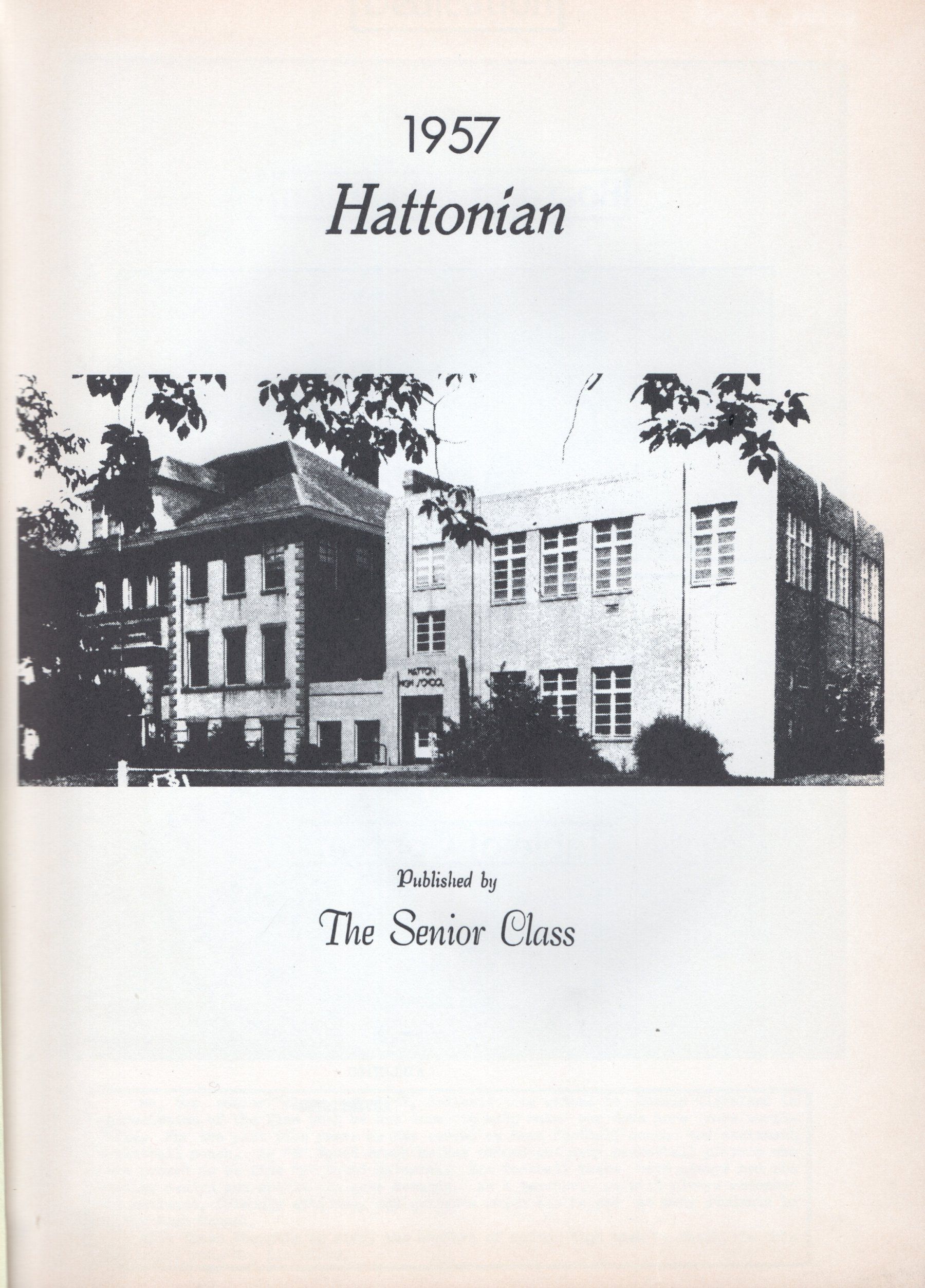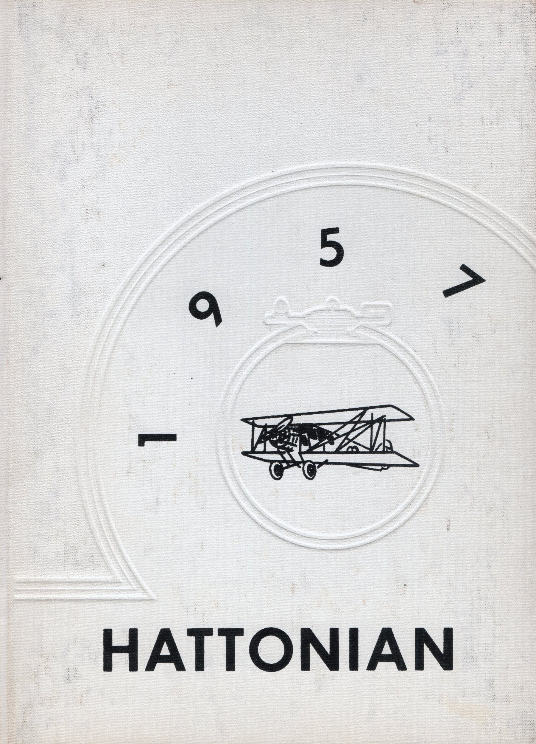 The Class of 1957 Hatton High School Yearbook, titled "1957 Hattonian", includes a photograph of the Hatton High School Class of 1957, which is included on page 64 in the All School Reunion book, "Hatton Flyers".