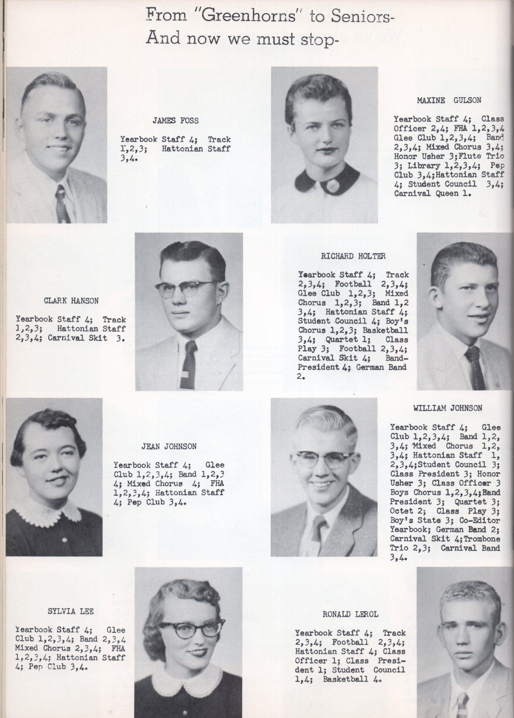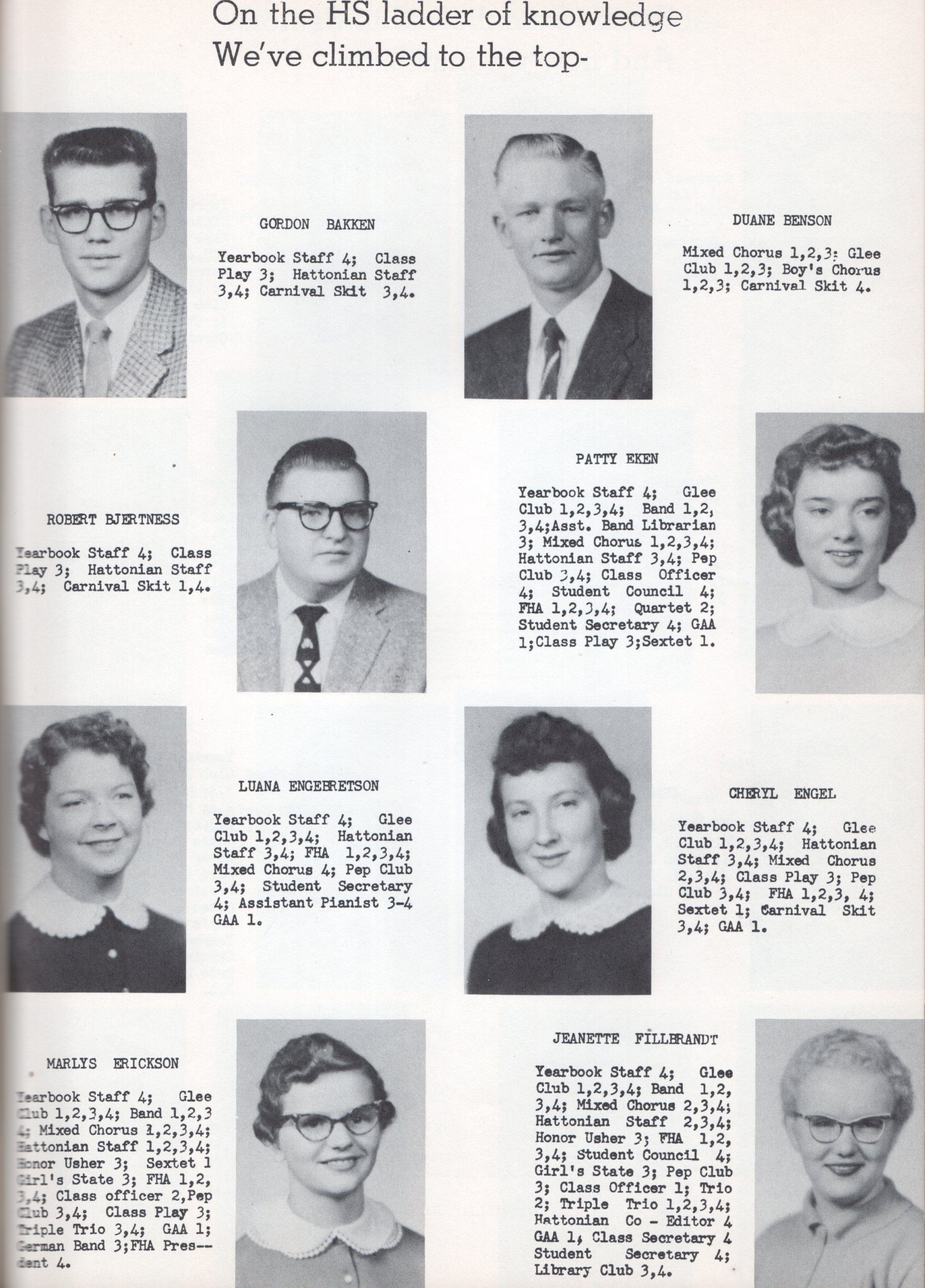 The 1957 yearbook includes four pages of Senior student photographs for: Gordon Bakken, Duane Benson, Robert Bjertness, Patty Eken, Luana Engebretson, Cheryl Engel, Marlys Erickson, Jeanette Fillbrandt, James Foss, Maxine Gulson, Clark Hanson, Richard 'Ricky' Holter, Jean Johnson, William Johnson, Sylvia Lee, Ronald Lerol, Gerald Lillemoen, David Meldahl, Raymond Nelson, Andrew Ostlie, David Peterson, Mary Pladson, Ray Pladson, Sandra Pladson, LeAnne Solberg, Cynthia Teie, Charlotte Thompson, Chester Thompson, Elnor Thompson, Shirley Thompson, John Vaagene, and Ivan Wambheim. Not Pictured: Dennis Cordahl.