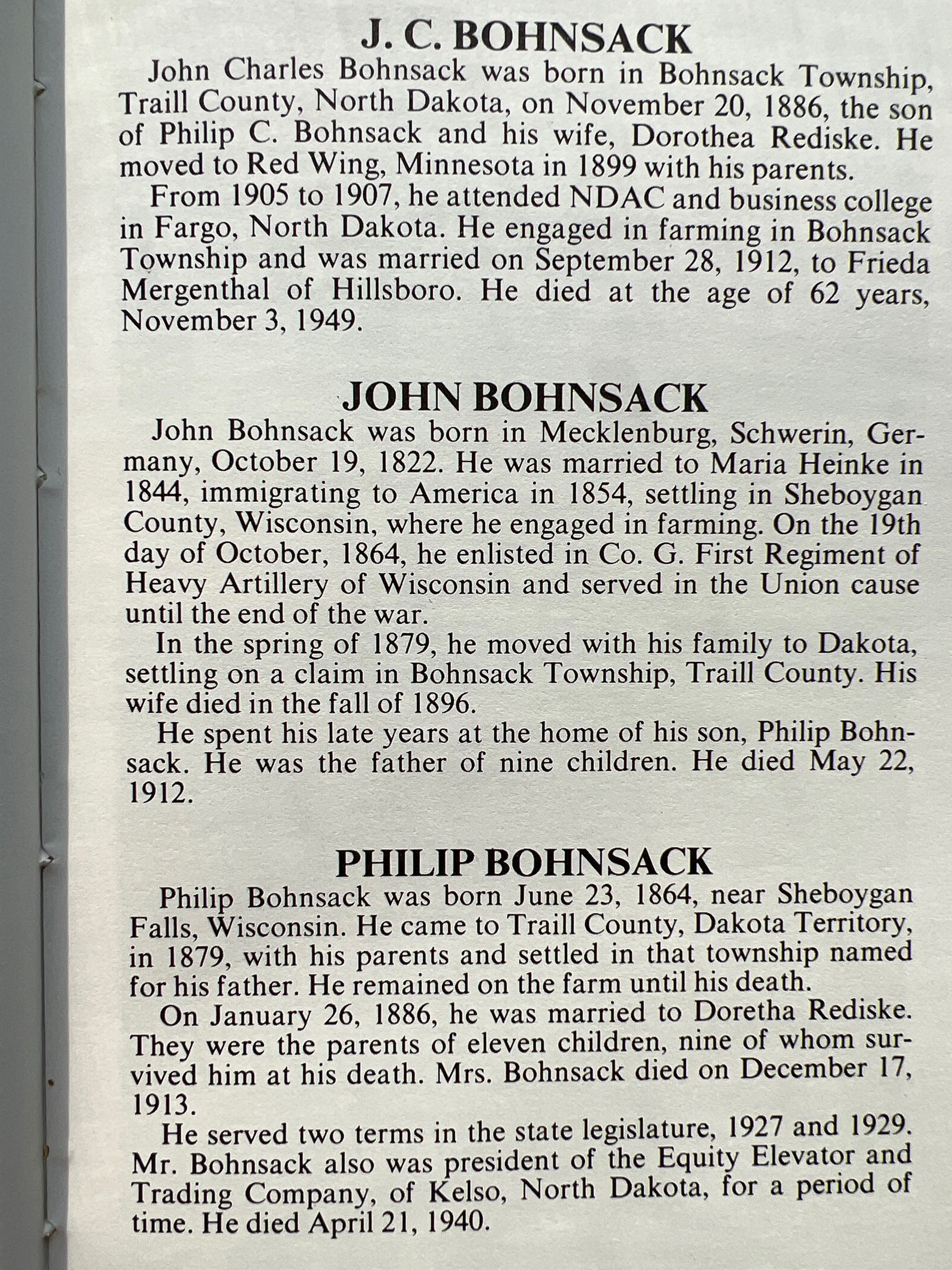 John and Maria Bohnsack are the parents of William, Charles and Philip Bohnsack. Charles, or Chas, and Philip Bohnsack farmed in Bohnsack Township, as illustrated in the 1892 and 1909 Atlases for Traill County.