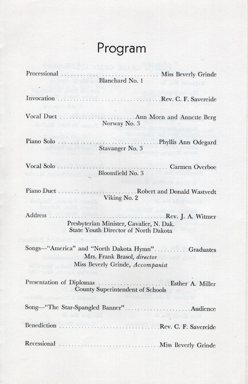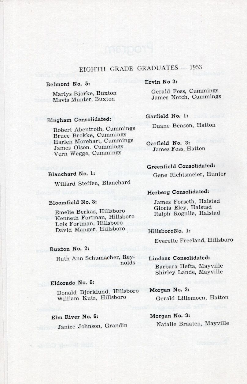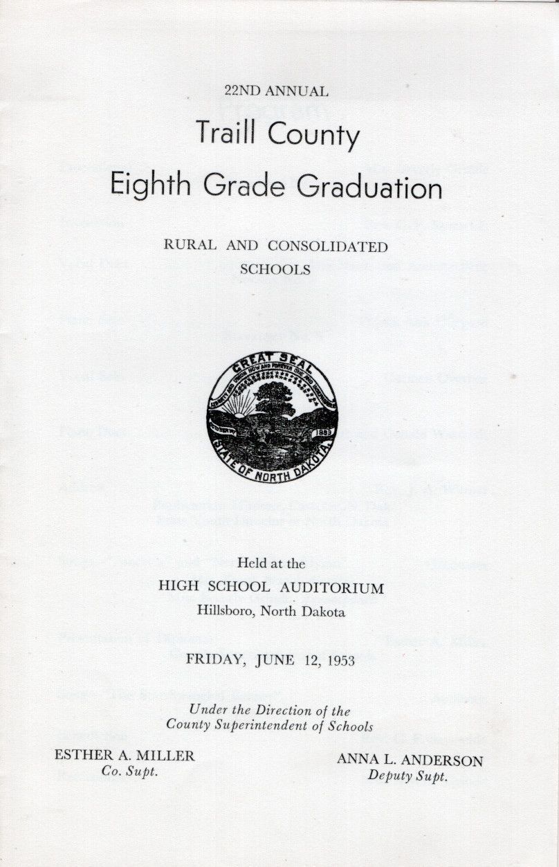 On 12 June 1953, Traill County Superintendent of Schools, Esther Miller, directed the 22nd Annual Eighth Grade Graduation program for rural and consolidated schools, which was held at the Hillsboro High School Auditorium. The program for rural school graduates began with a Processional and ended with a Benediction and Recessional.