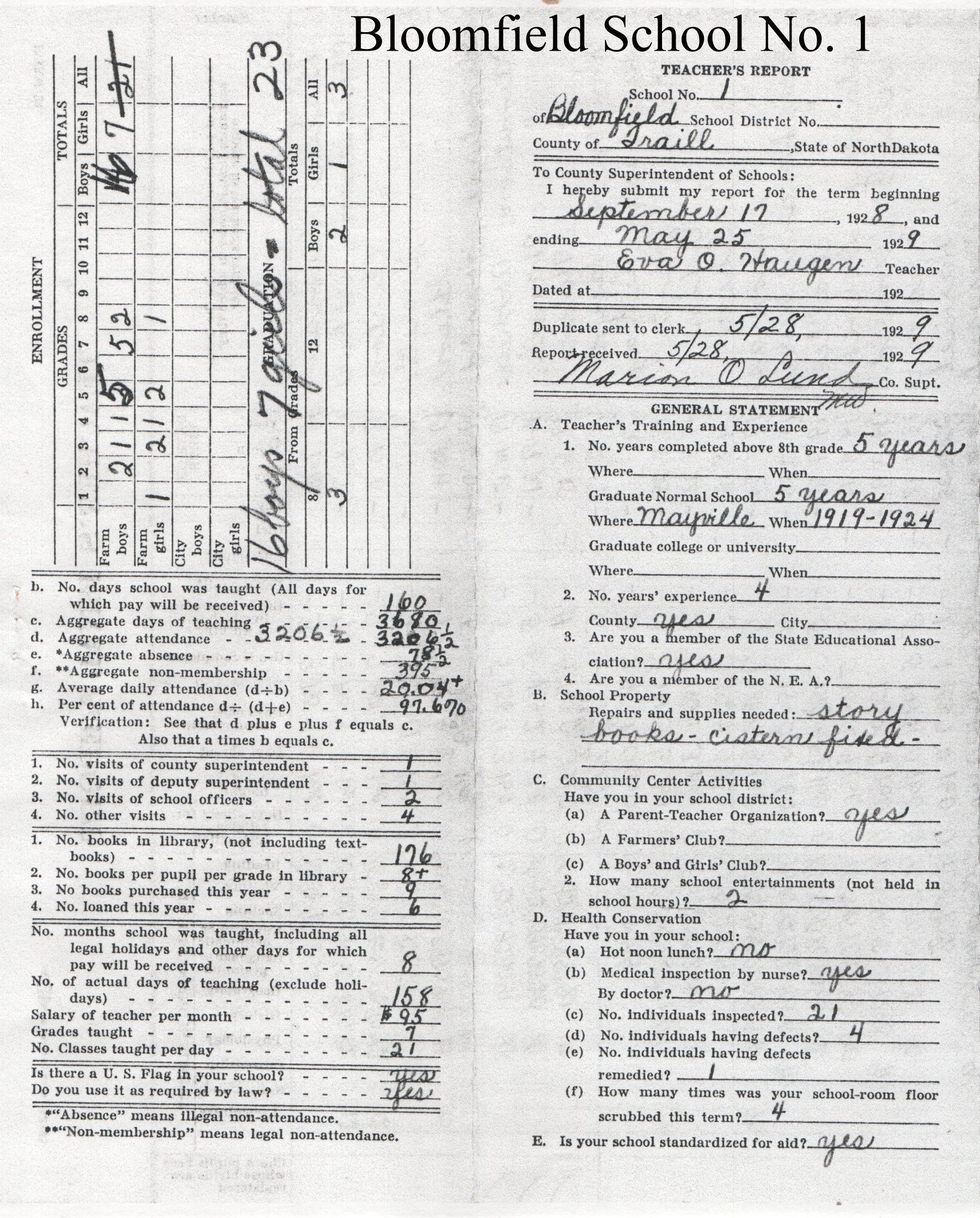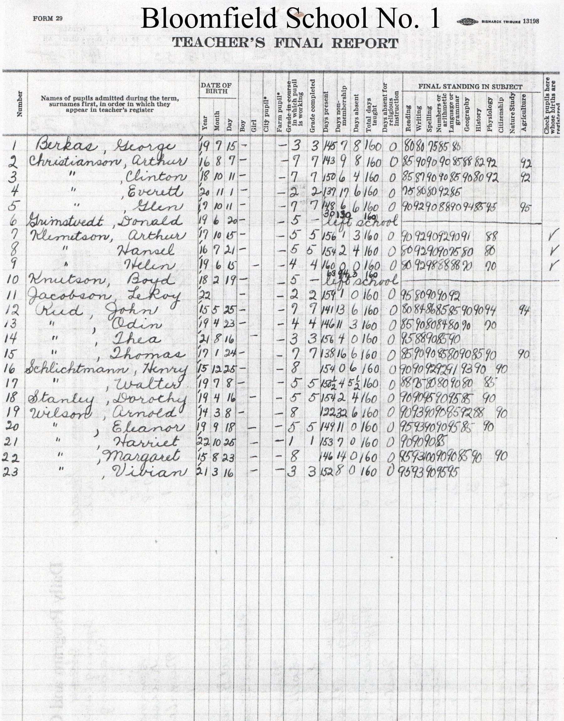 On 28 May 1929, Bloomfield School No. 1 teacher Eva O. Haugen reported attendances and standings in studies pursued for 23 students, including George Berkas, Arthur Christianson, Clinton Christenson, Everett Christianson, Glen Christianson, Donald Grimstvedt, Arthur Klemetson, Hansel Klemetson, Helen Klemetson, Boyd Knutson, LeRoy Jacobson, John Rud, Odin Rud, Thea Rud, Thomas Rud, Henry Schlichtmann, Walter Schlichtmann, Dorothy Stanley, Arnold Wilson, Eleanor Wilson, Harriet Wilson, Margaret Wilson and Vivian Wilson.