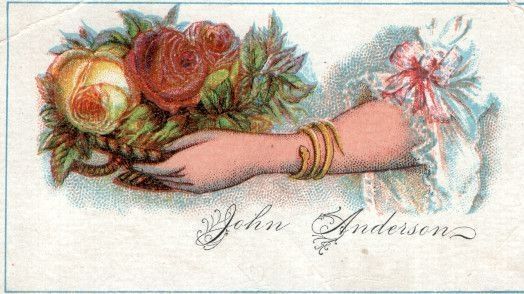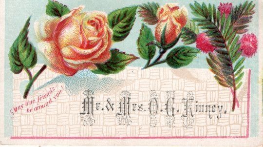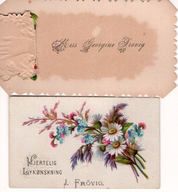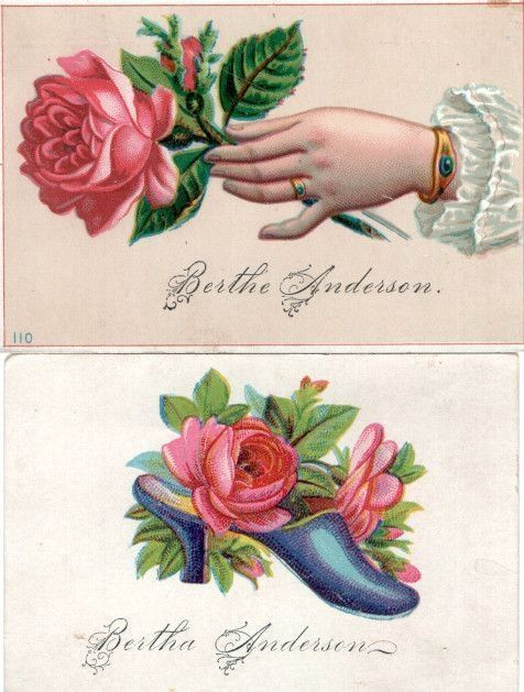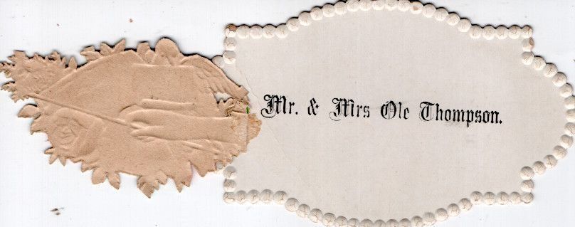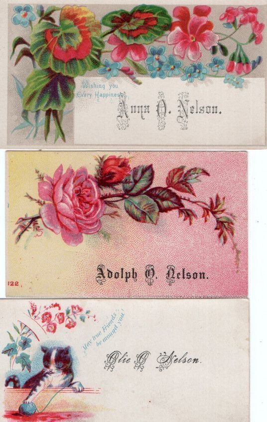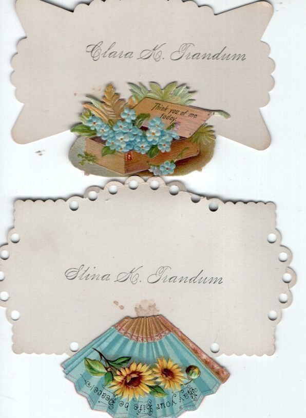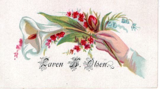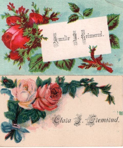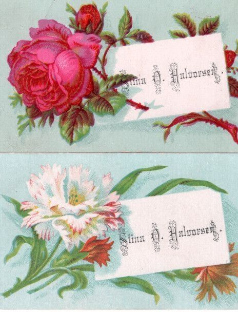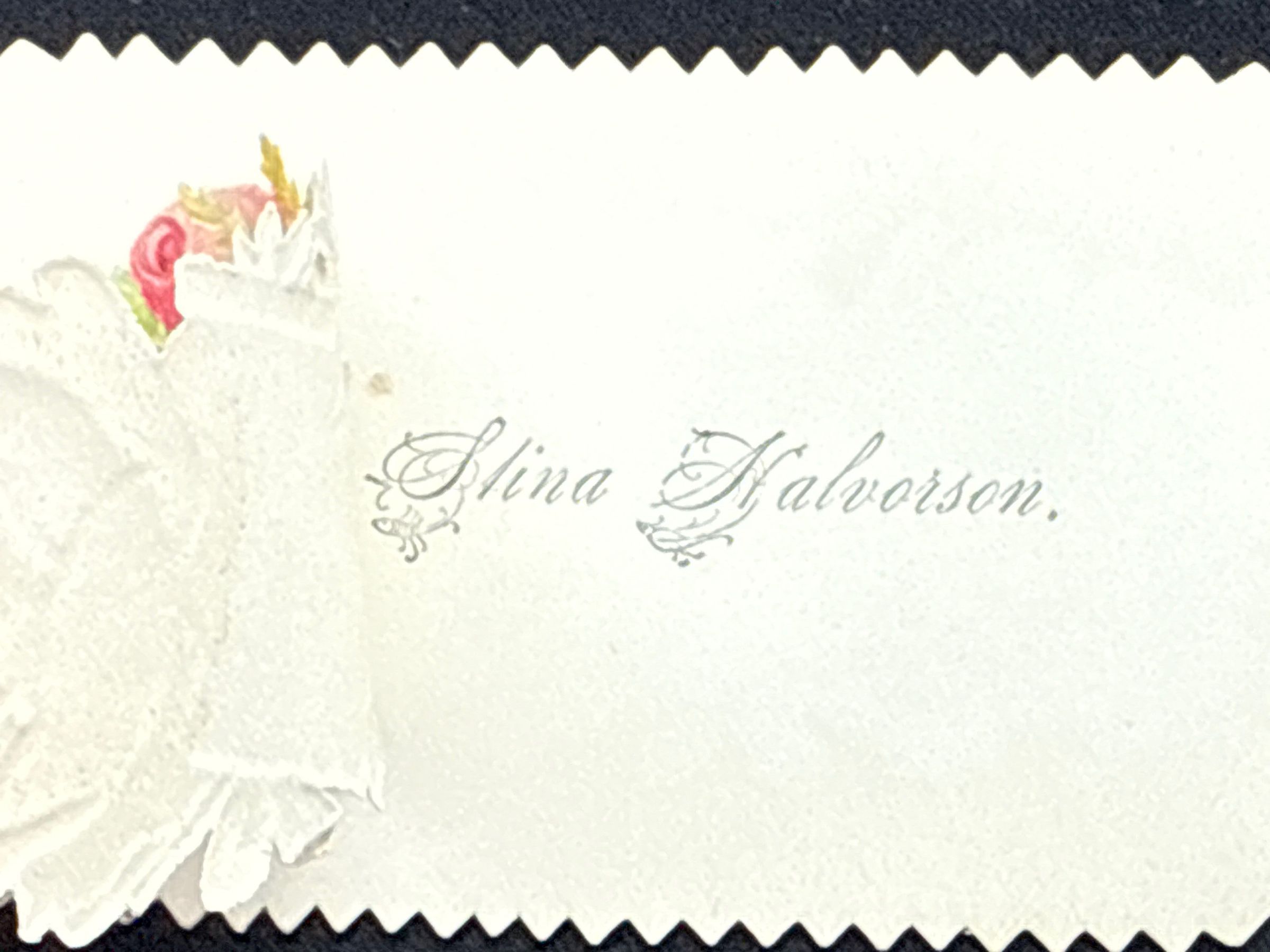 As a young woman in her 20s, Stina Halvorson had calling cards produced with floral designs, as shown at left. Stina also had calling cards with her name beneath a flap with a floral design (see below). Stina also collected calling and name cards from family, friends, and special events, which were in the Hovet Collection donated to the Traill County Historical Society.