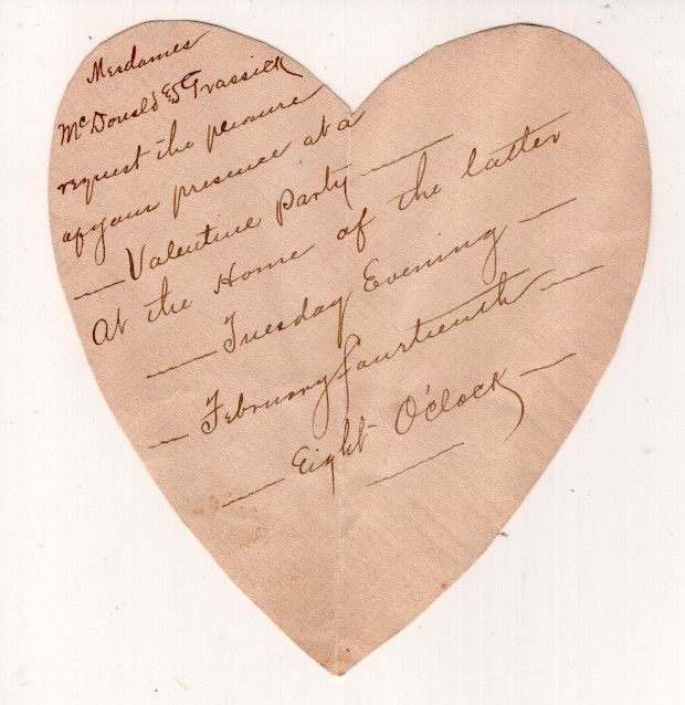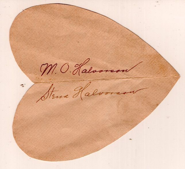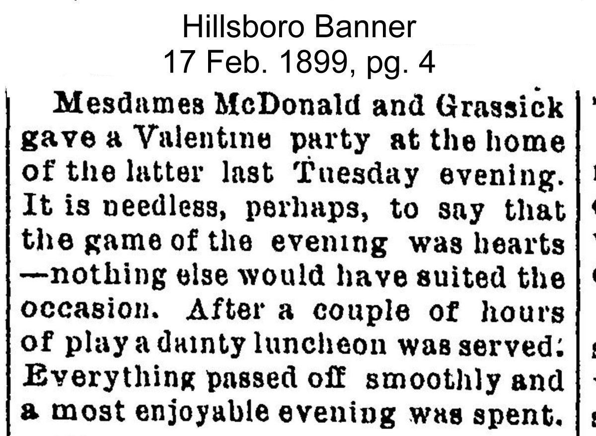A special event was an invitation to a Valentines party for Stina, age 32, and her brother Mathias O. Halvorson, 35 (see below), hosted by "Madame's McDonald and Grassick", as shown on the back of the invitation (see below) and as reported on page 4 in the Hillsboro Banner on 17 February 1899.