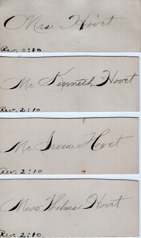 Name cards for Stina and her three children, Kenneth, Irvin and Thelma, from an event that featured Revelations 2:10 were in the Hovet Collection (see below).