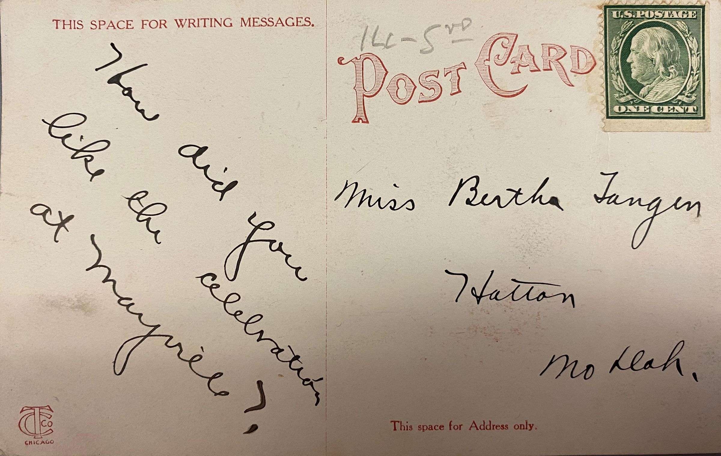 Postcard - To Miss Bertha Tangen in Hatton, ND - Traill County CourthouseEntry/Object ID