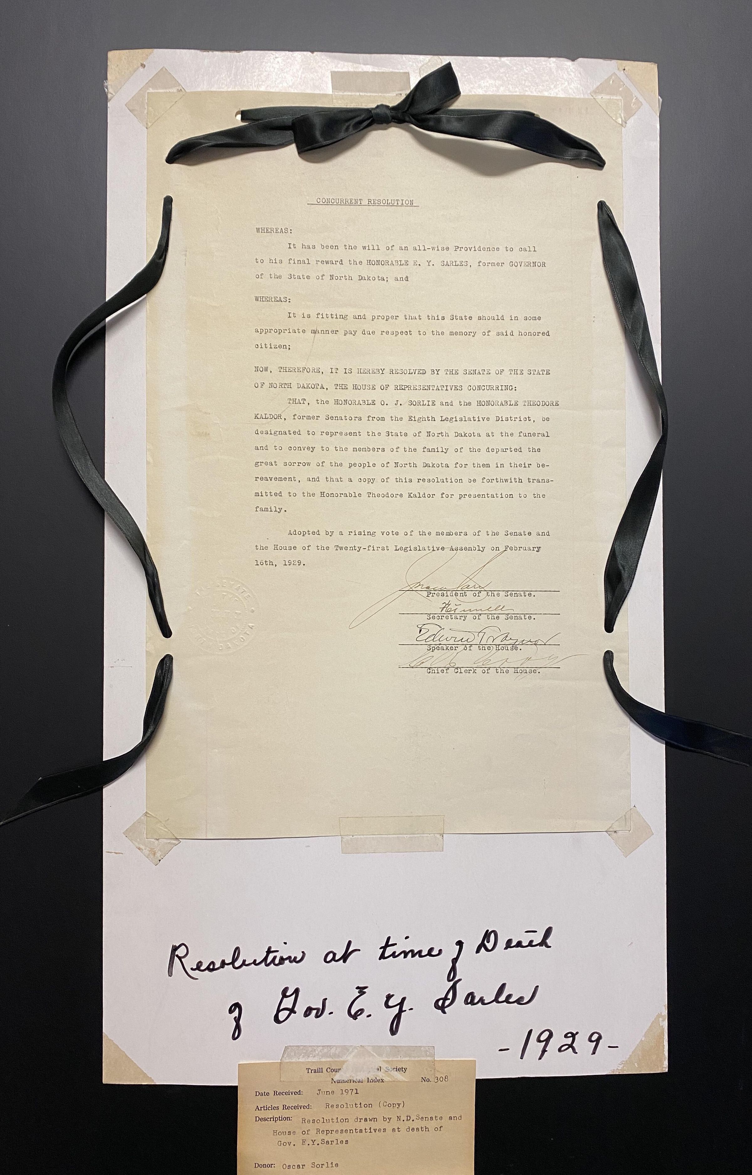 Copy of Resolution drawn by ND Senate and House of Representatives at the time of Governor E. Y.