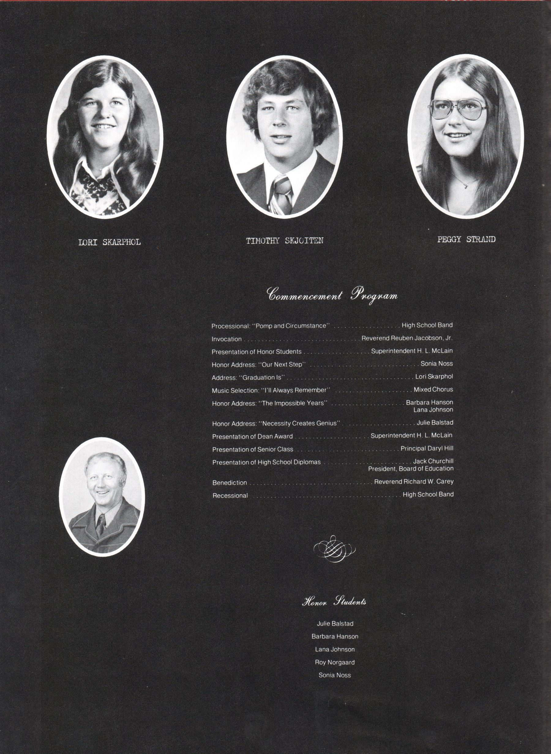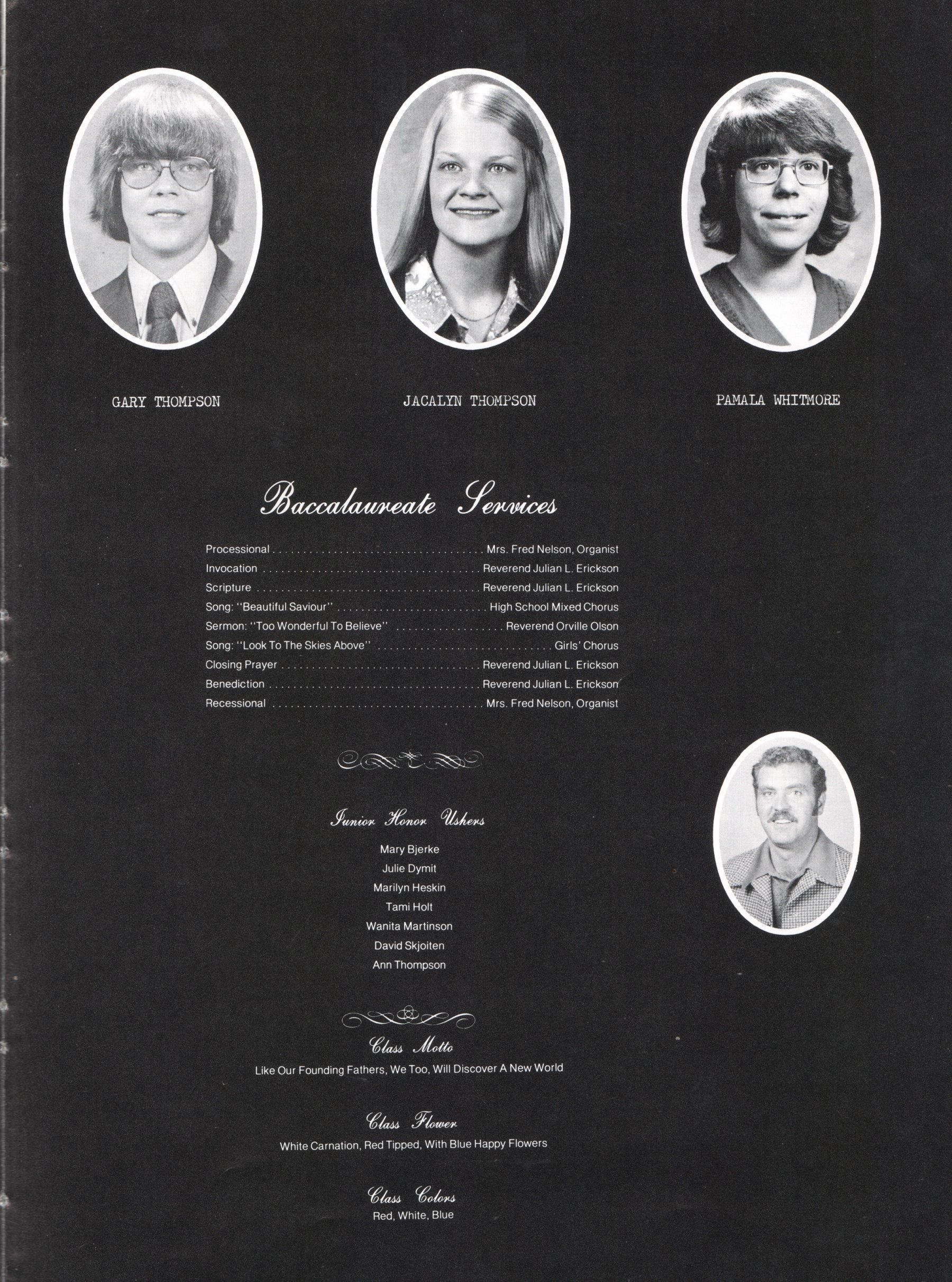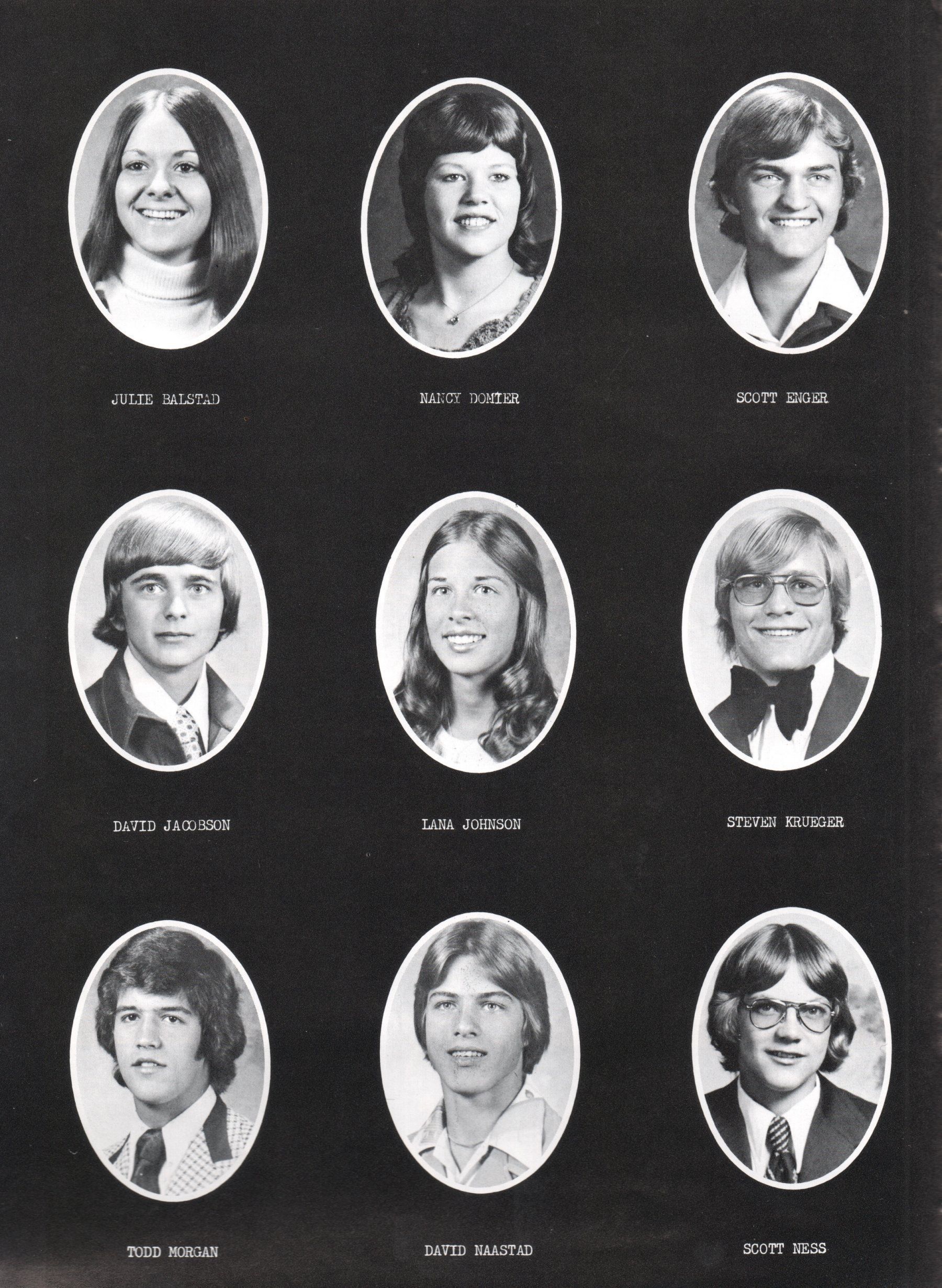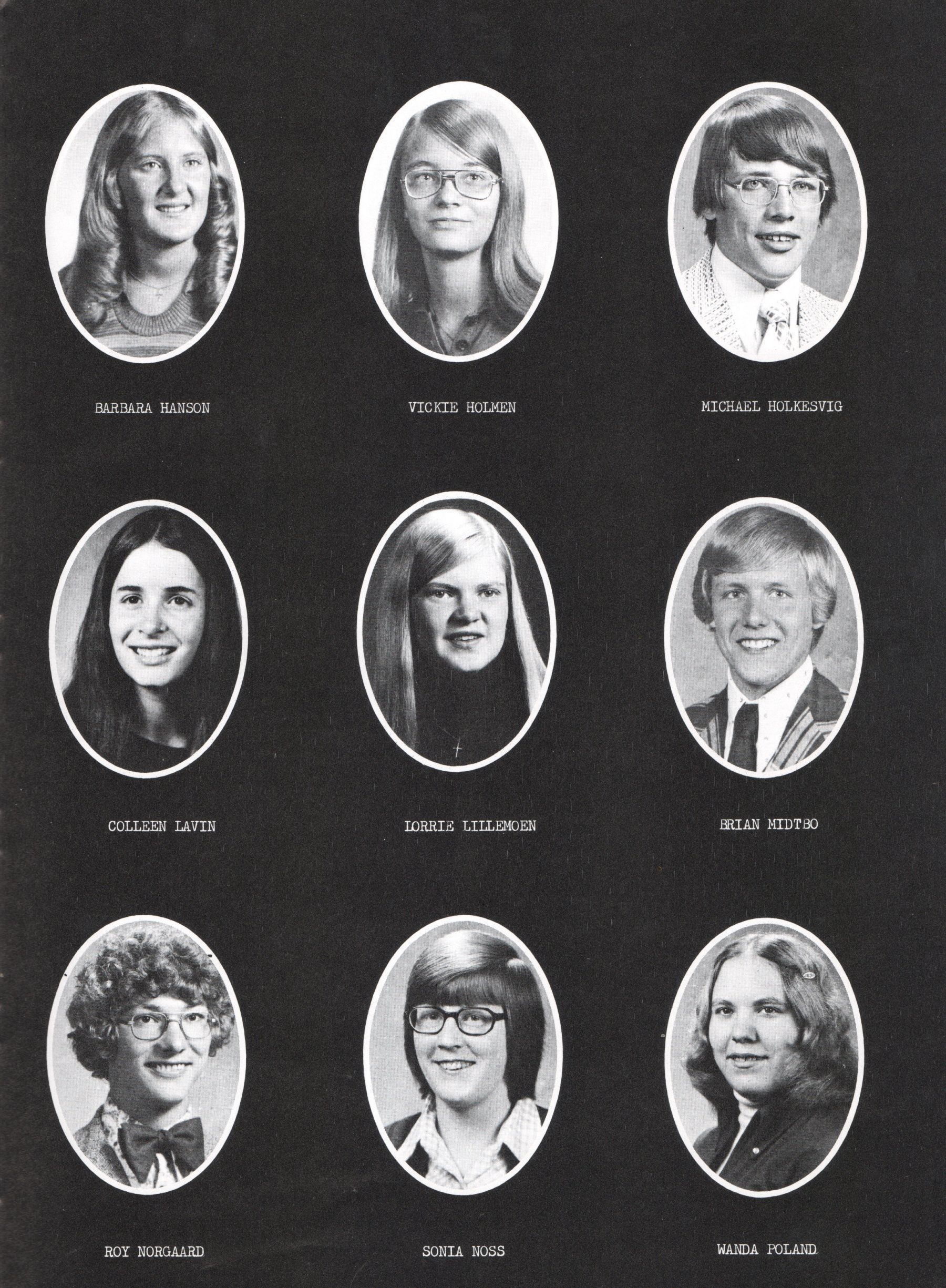 The 1976 yearbook includes four pages of Senior student photographs for: Julie Balstad, Nancy Domier, Scott Enger, Barbara Hanson, Vickie Holmen, Michael Holkesvig, David Jacobson, Lana Johnson, Steven Krueger, Collen Lavin, Lorrie Lillemoen, Brian Midtbo, Todd Morgan, David Naastad, Scott Ness, Roy Norgaard, Sonia Noss, Wanda Poland, Lori Skarphol, Timothy Skjoiten, Peggy Strand, Gary Thompson, Jacalyn Thompson, and Pamala Whitmore.