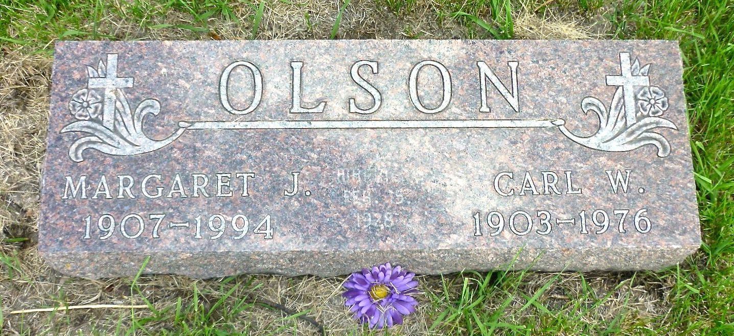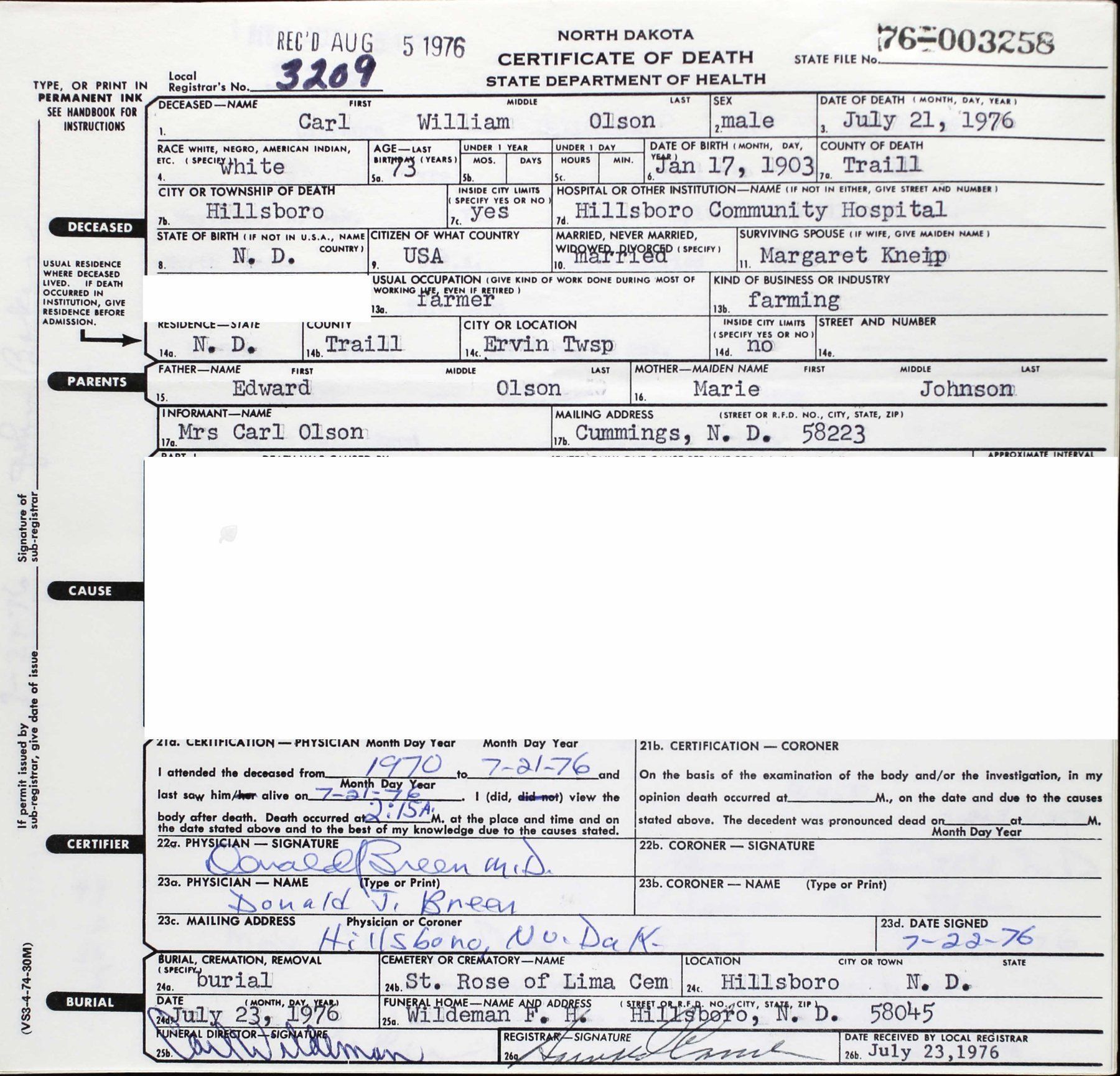 Carl William Olson lived to the age of 73, passing away on 21 July 1976 at the Hillsboro Community Hospital [ND Death Certif., below]. Carl was interred at St. Rose of Lima Cemetery, Hillsboro, ND [US FaG grave-marker, below].