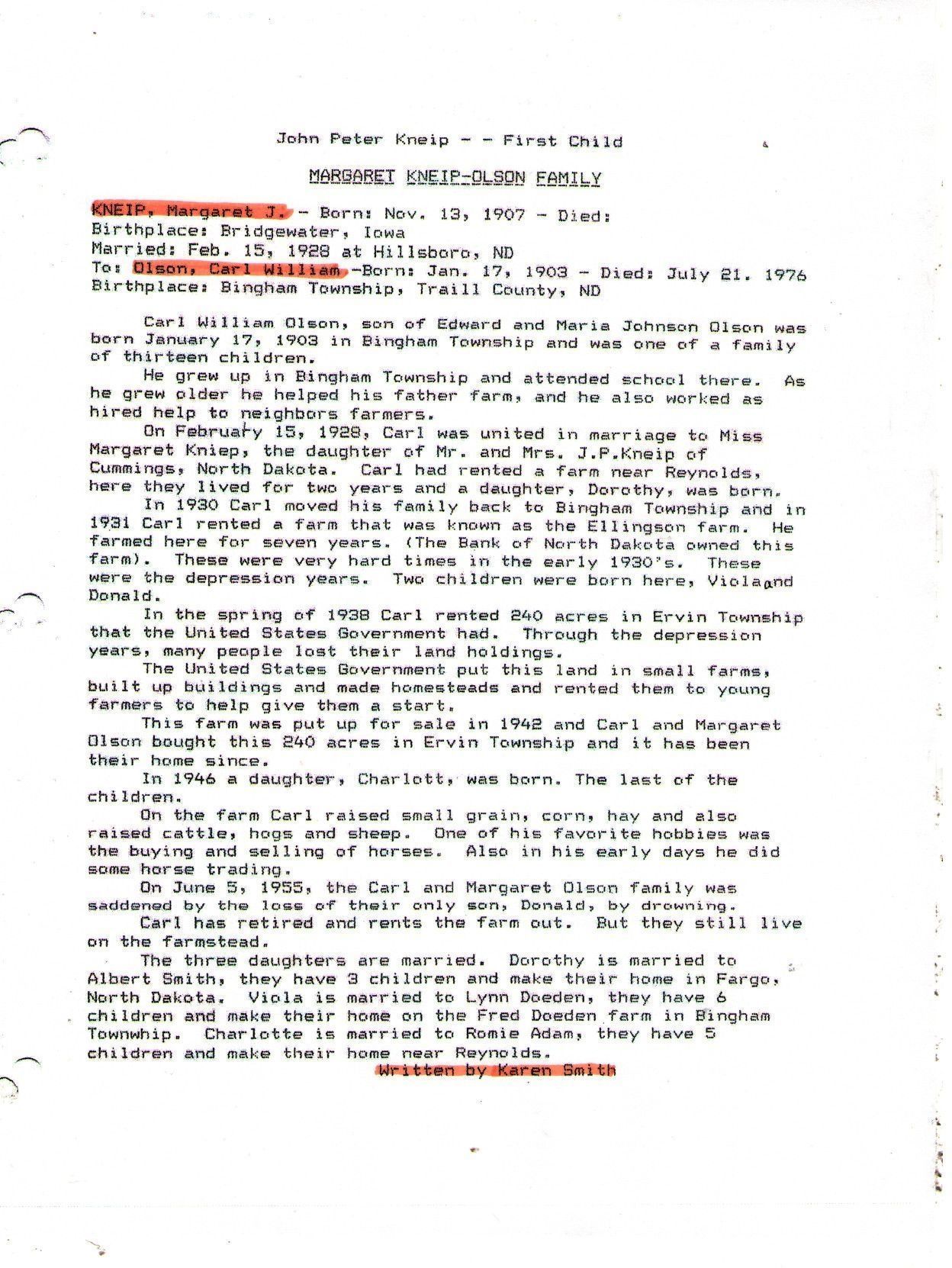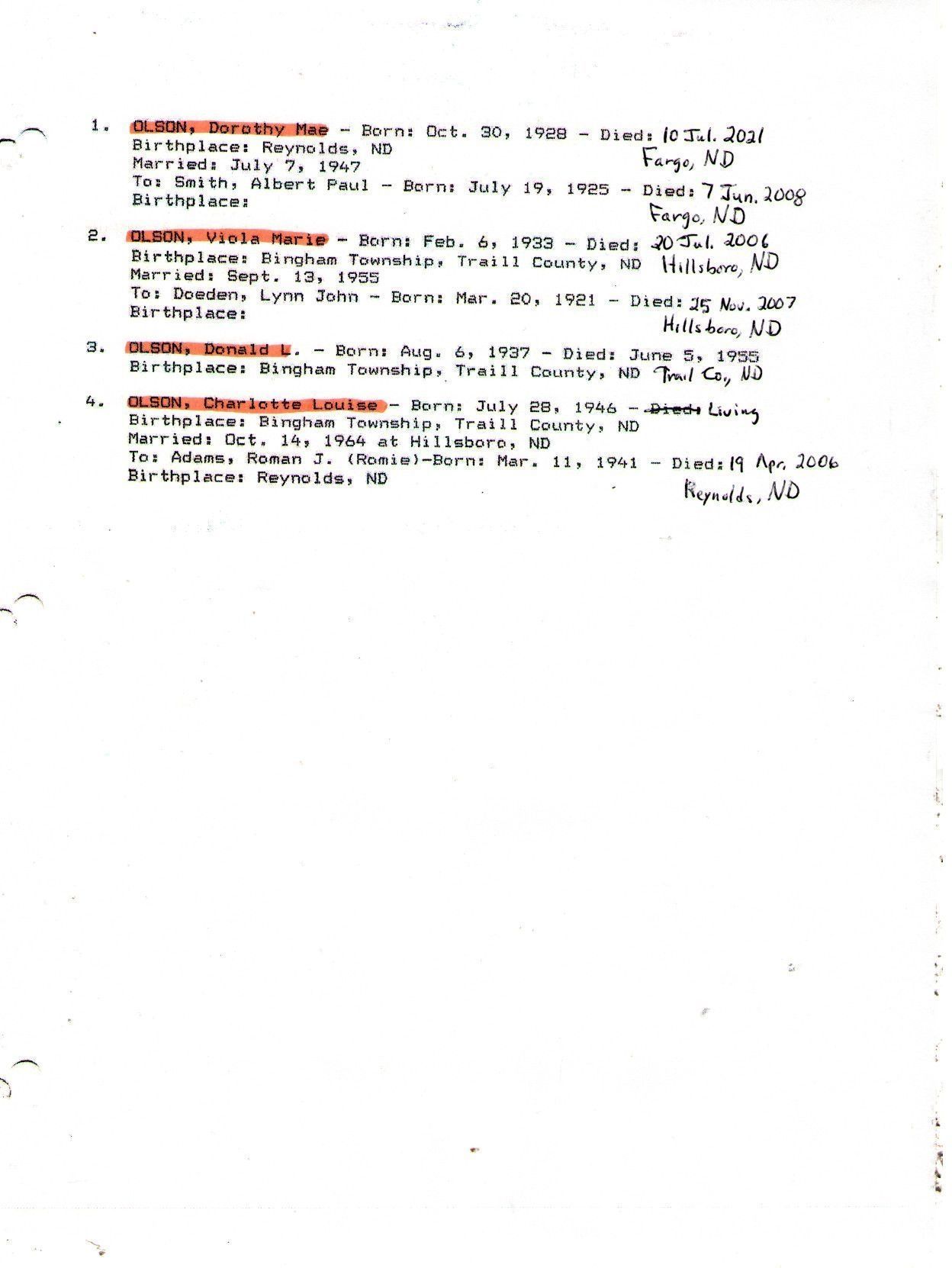Carl William and Margaret Julia (Kneip) Olson had four children (see page 10 from Kneip_Genealogy.pdf, below), including Dorothy Mae Olson (b. 30 Oct. 1928; m. Albert Smith on 7 Jul. 1947, three children: Dale, Wayne & Linda Smith; d. 10 Jul 2021), Viola Marie Olson (b. 6 Feb. 1933; m. Lynn Doeden on 13 Sep. 1955, six children: Sharon, Steven, Robert, LeAnn, Ronald & Michael Doeden; d. 20 Jul. 2006), Donald L. Olson (b. 6 Aug. 1937; d. age 17, 5 Jun. 1955), and Charlotte Louise Olson (b. 28 Jul. 1946; m. Romie J. Adams on 14 Oct. 1964, five children: Timothy, Joan, Patrick, Jill & Jodi Adams; living). As noted on page 9 in Kneip_Genealogy.pdf, Carl and Margaret Olson's only son, Donald, tragically drowned as a teenager