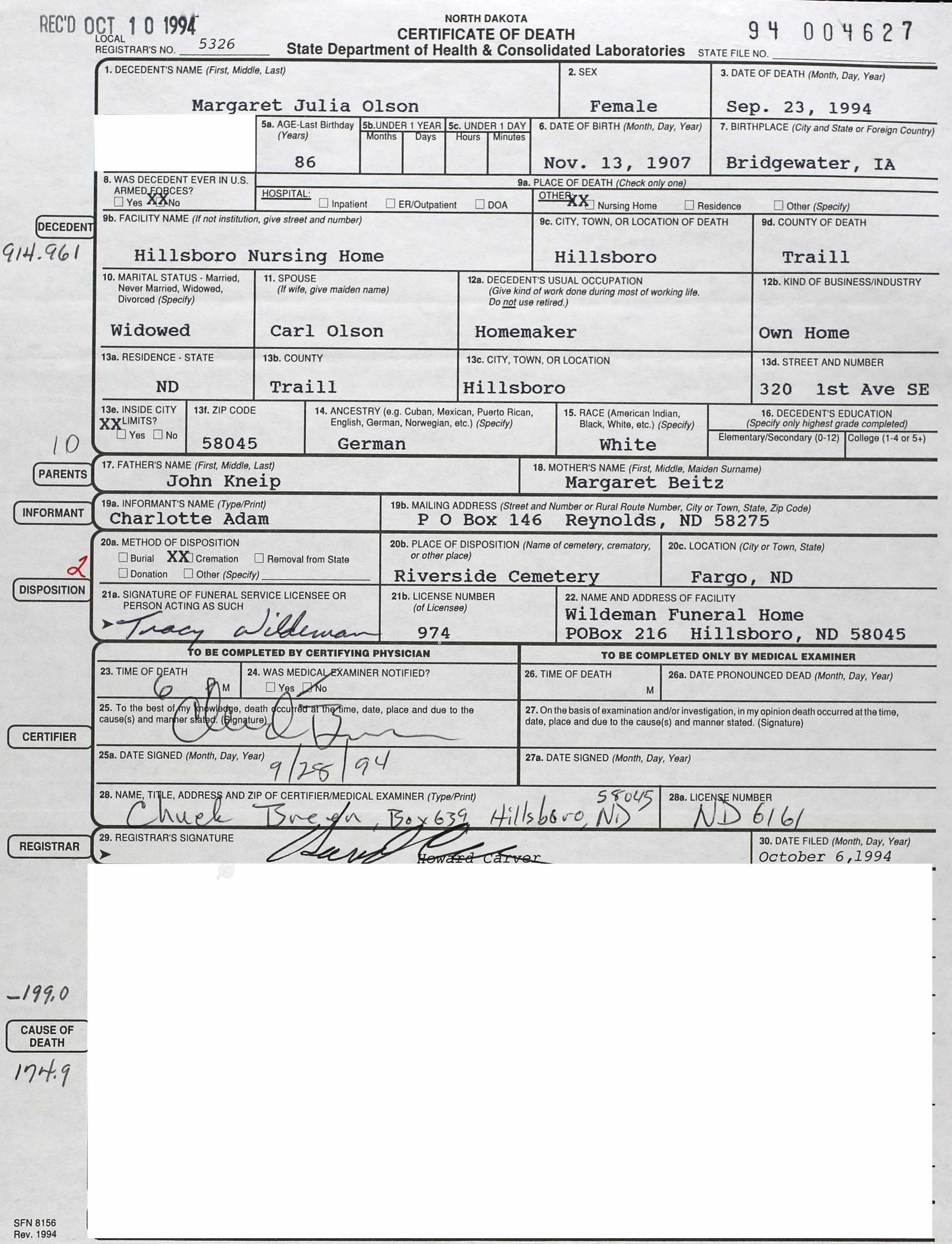 Margaret Julia (Kneip) Olson died, age 86, on 23 September 1994 at the Hillsboro Nursing Home [ND Death Certif., below]. Margaret was interred next to Carl at St. Rose of Lima Cemetery, Hillsboro, ND [US FaG grave-marker, below].