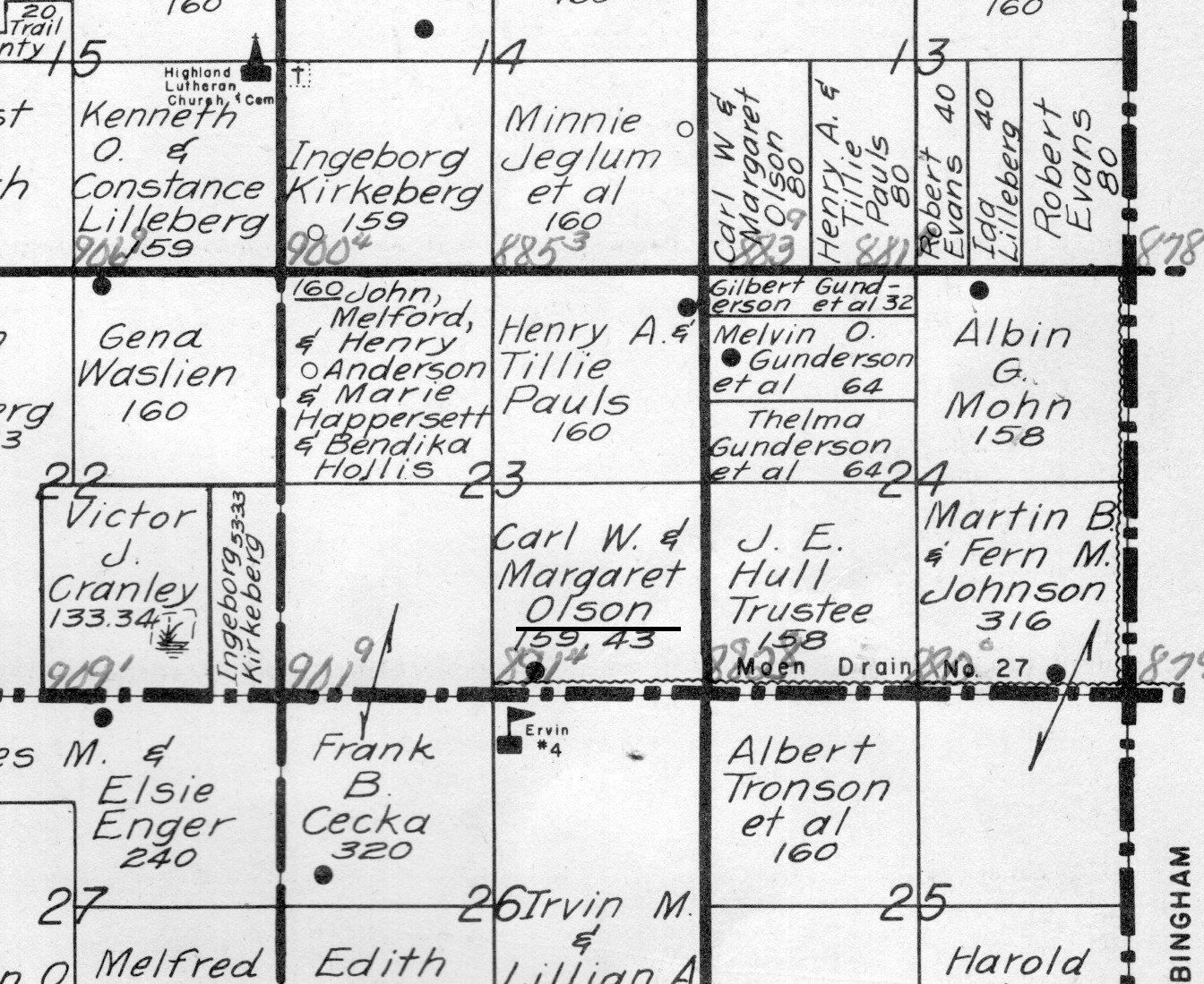 This family history folder contains a number of documents and photographs on the lives of the Carl William Olson and Margaret Julia Kneip (wedding photo, left). Carl and Margaret farmed in Ervin Township, Traill County (1952 map, below) until they retired and rented their farmland.