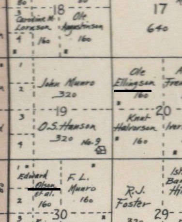 From page 9 written by Karen Smith in a 78-page family history document titled "Kneip_Genealogy.pdf" compiled by Karen (Fleischer) Ackerman* (below), we know that Carl Willliam Olson was born on 17 January 1903 to parents Edward and Maria (Johnson) Olson (also see TCHS Catalogit family history entry 2022.476.1). Carl was one of 13 children raised on their parent's farm in the NW Qtr. of Sect. 30 in Bingham Township in Traill County, ND (1900 map, below).