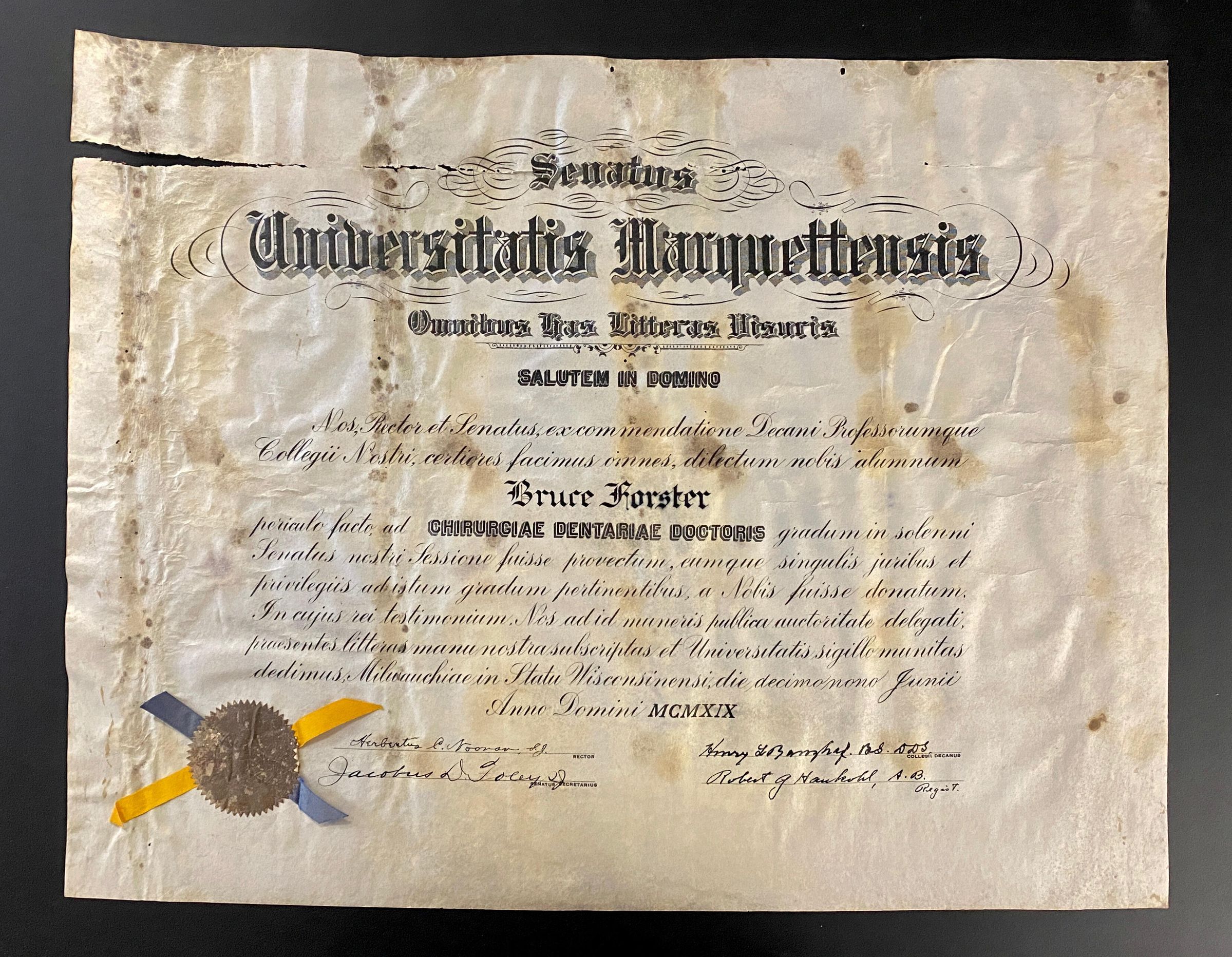 1919 Dental Diploma - Bruce Forster, Marquette University, Milwaukee, WI.