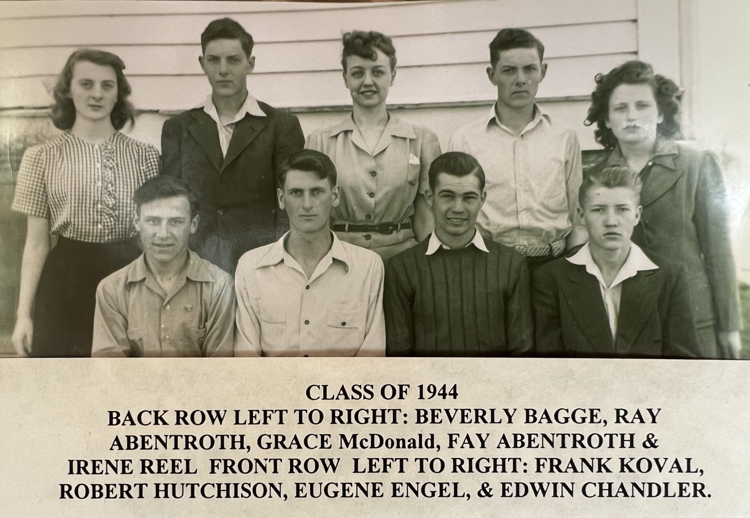 This photograph of the Caledonia High School Class of 1944 was taken by Olson Photo, Hillsboro, Traill County, ND. In the back row, left to right: Beverly Bagge, Ray Abentroth, Grace McDonald Fay Abentroth and Irene Reel. In the front row, left to right: Frank Koval, Robert Hutchinson, Eugene Engel and Edwin Chandler.