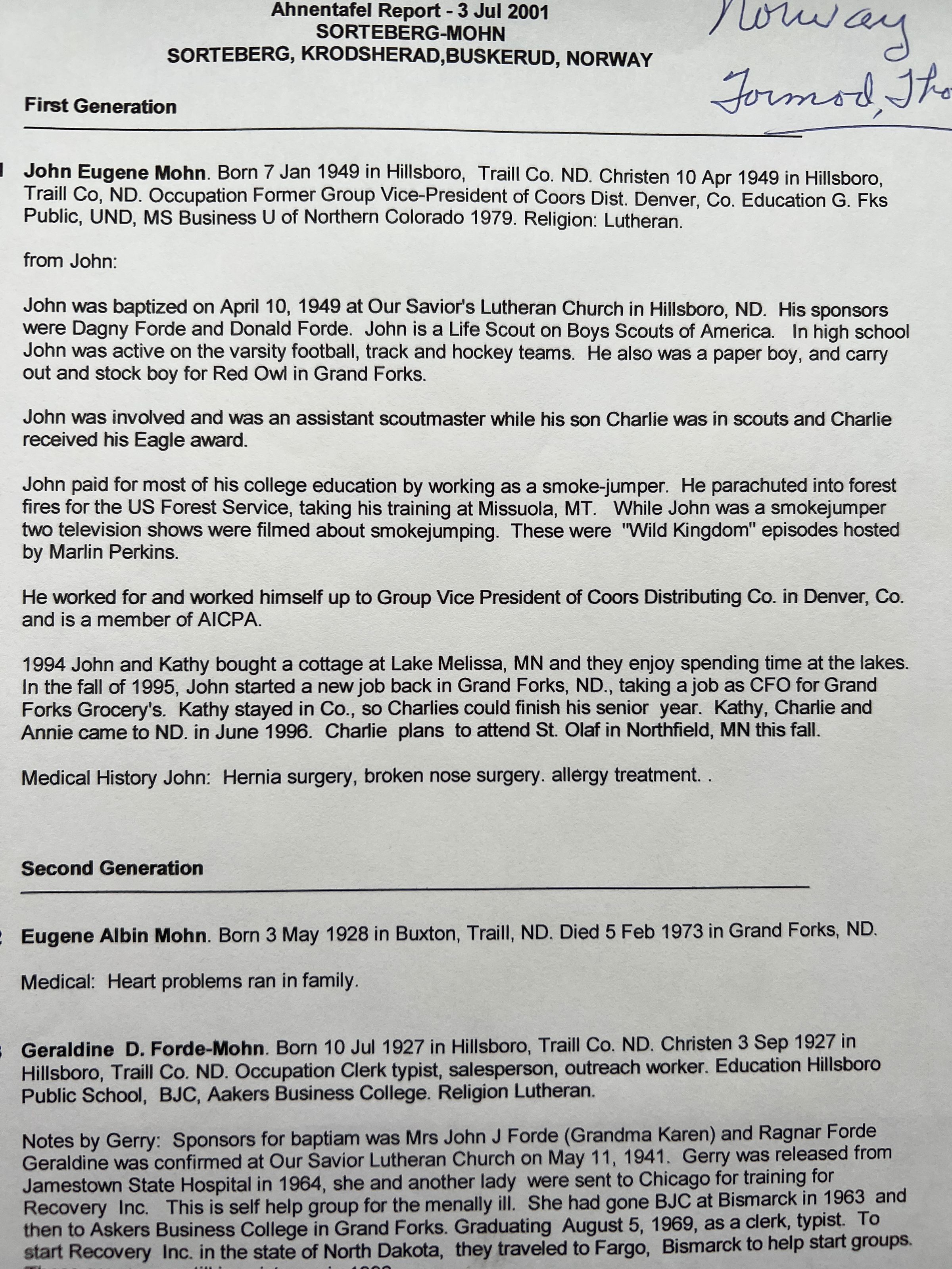This folder has a report on the family of John Eugene Mohn, son of Geraldine D. 'Gerry" Forde-Mohn. This file also has a report on Henry A Berg's Ahnetafel; a translation of The Sigdalslag 1920; and web search results for ancestors of Gunnar Aslesen, Asle Narvesen and many others from Buskerud, Norway. Gerry Mohn also did web search results for numerous Thoresens; correspondence about Amund Hansen; descendants report for Eiliv Bjornsen (1430 - ?), Hands (1688 - ?) and John Eugene Mohn (1919 - ?).Cataloged By