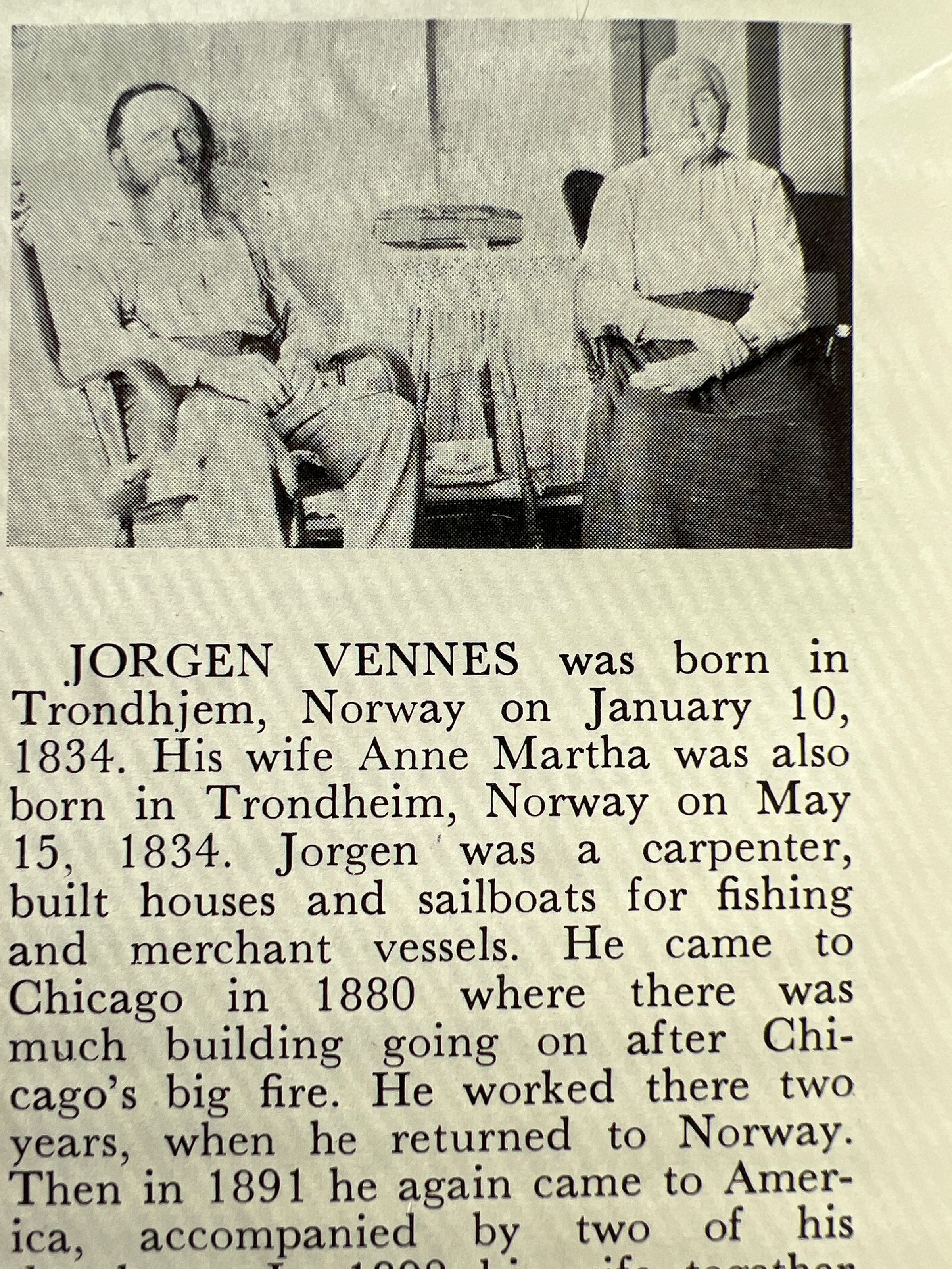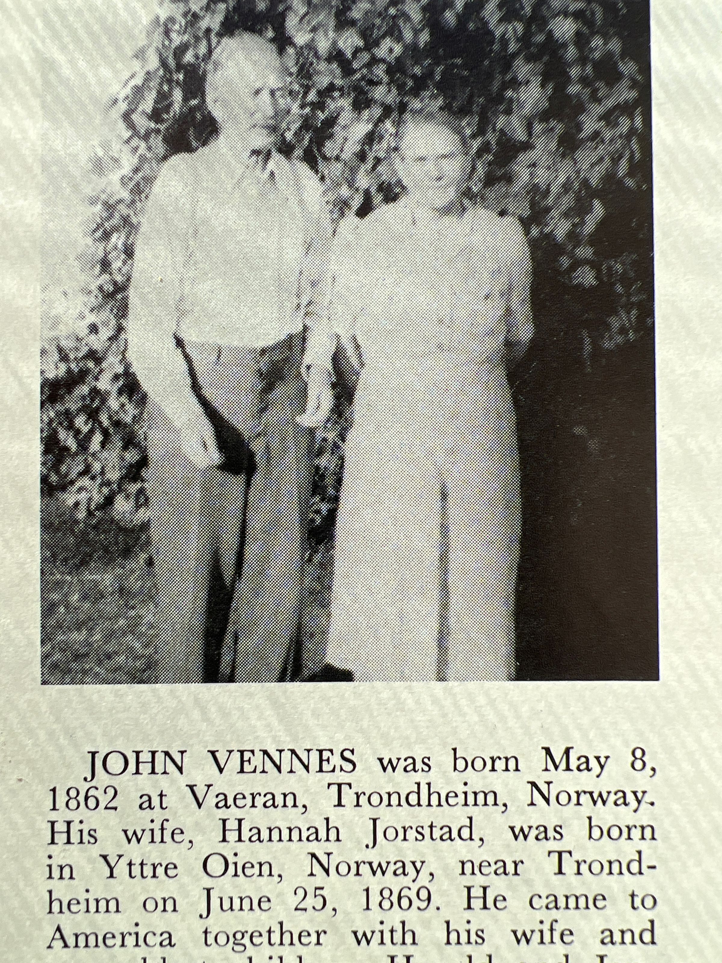 This file has photocopies of information about Jorgen and Anne Vennes and John and Hannah (Jorstad) Vennes from "Pioneers" History of Old Settlers' Association, which includes marriage records for various Vennes family members.
